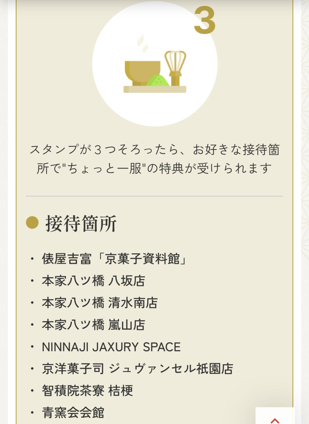 🍵在京都综合观光案内所(京都站二楼)和各参观地点可以领盖章纸。每个售票处都有盖章,积满三个可以在指定场所领取抹茶加和菓子一份。