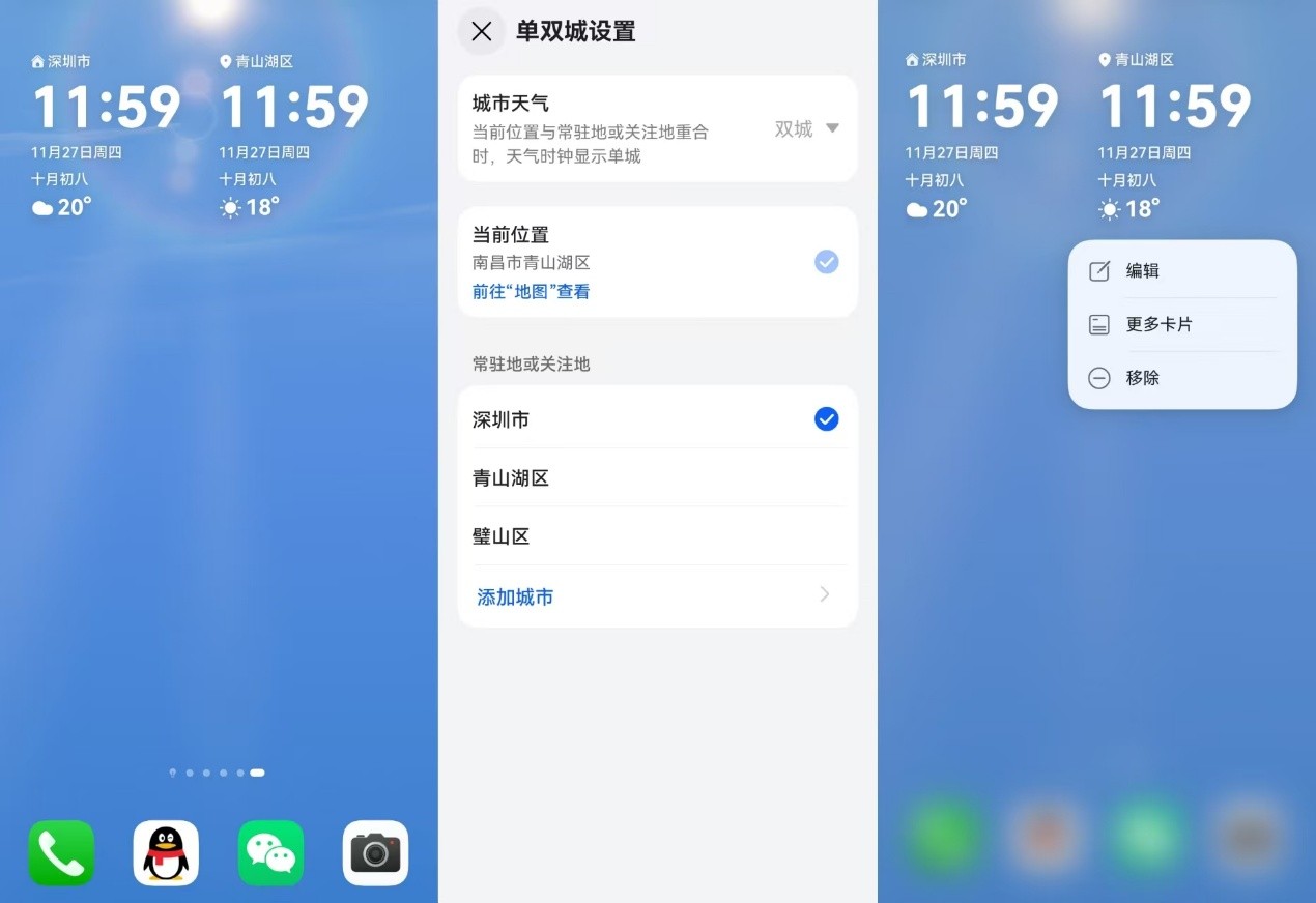 比如说,我从南昌出发前往深圳参加星光之夜,长按华为天气App后选择一款合适的“天气时钟”卡片放在桌面,提前将两地的天气添加到时钟卡片中,随时就能够掌握两地的温差和天气变化,避免因两地气候差异影响行程。当然添加卡片后,大家也别忘记打开卡片的“双城”模式。