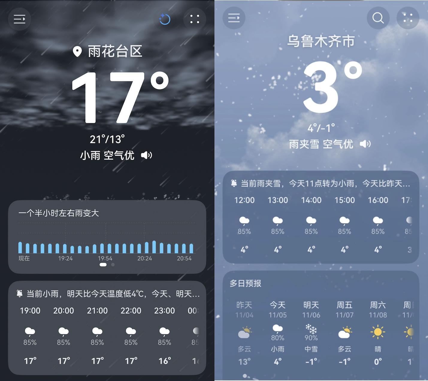 我还特别喜欢它的实时天气交互动效,遇到下雪或者下雨,进入华为天气轻轻摇晃手机,屏幕上的积雪会随之散开。倾斜设备,雨滴仿佛随重力流动。这种沉浸式的交互,让我查看天气时不仅获取了信息,还多了一份小乐趣。