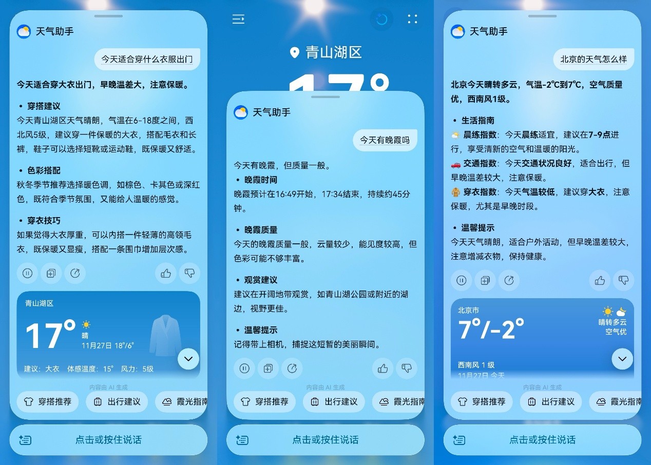 或者直接问它今天适合穿什么衣服出门,作为一个喜欢拍照的人,有时候我还会问它今晚有没有晚霞可拍。它总能快速给我贴心的建议,对我而言,它不只是天气预报,更像一位随时在线的气象顾问。