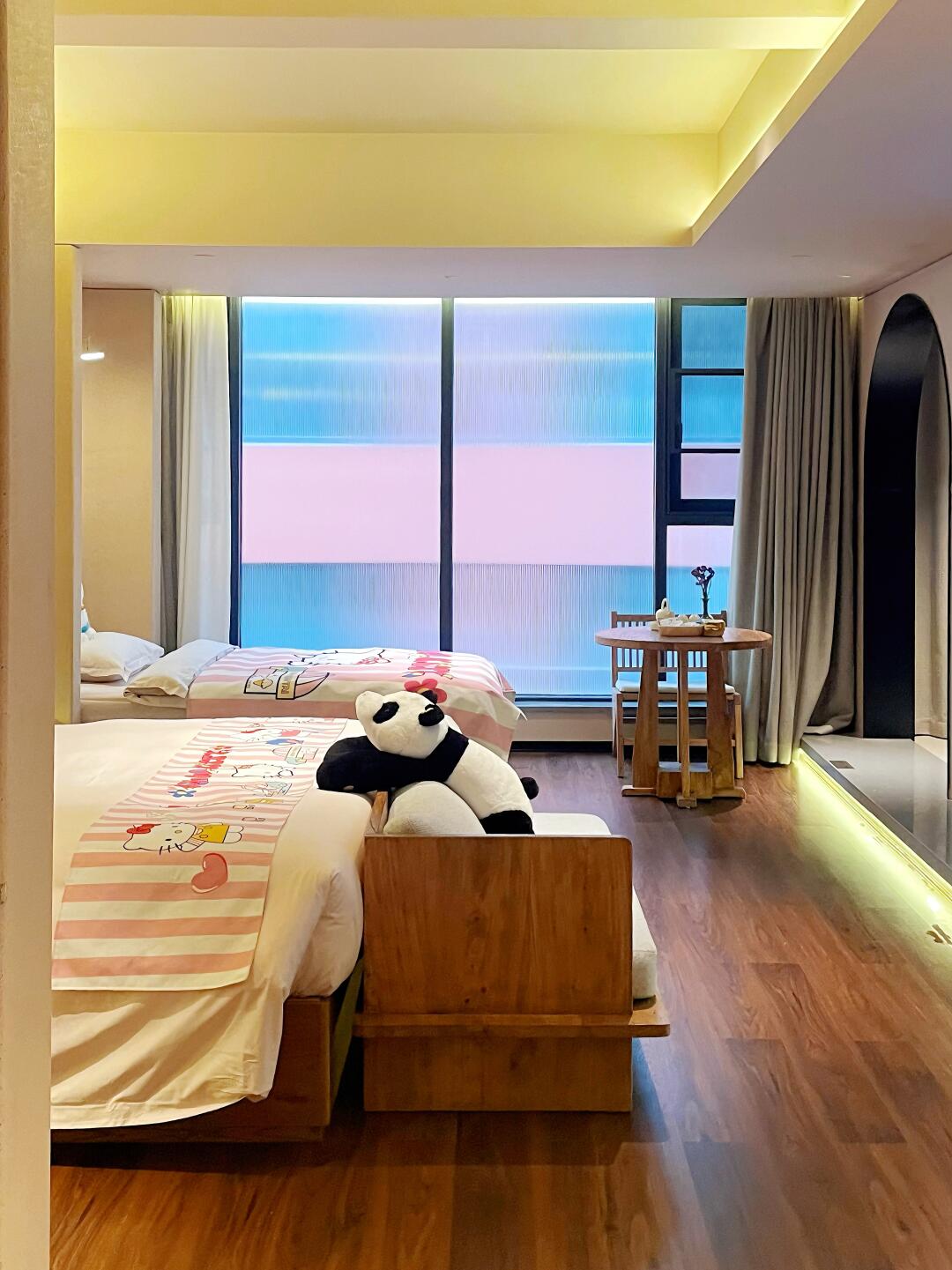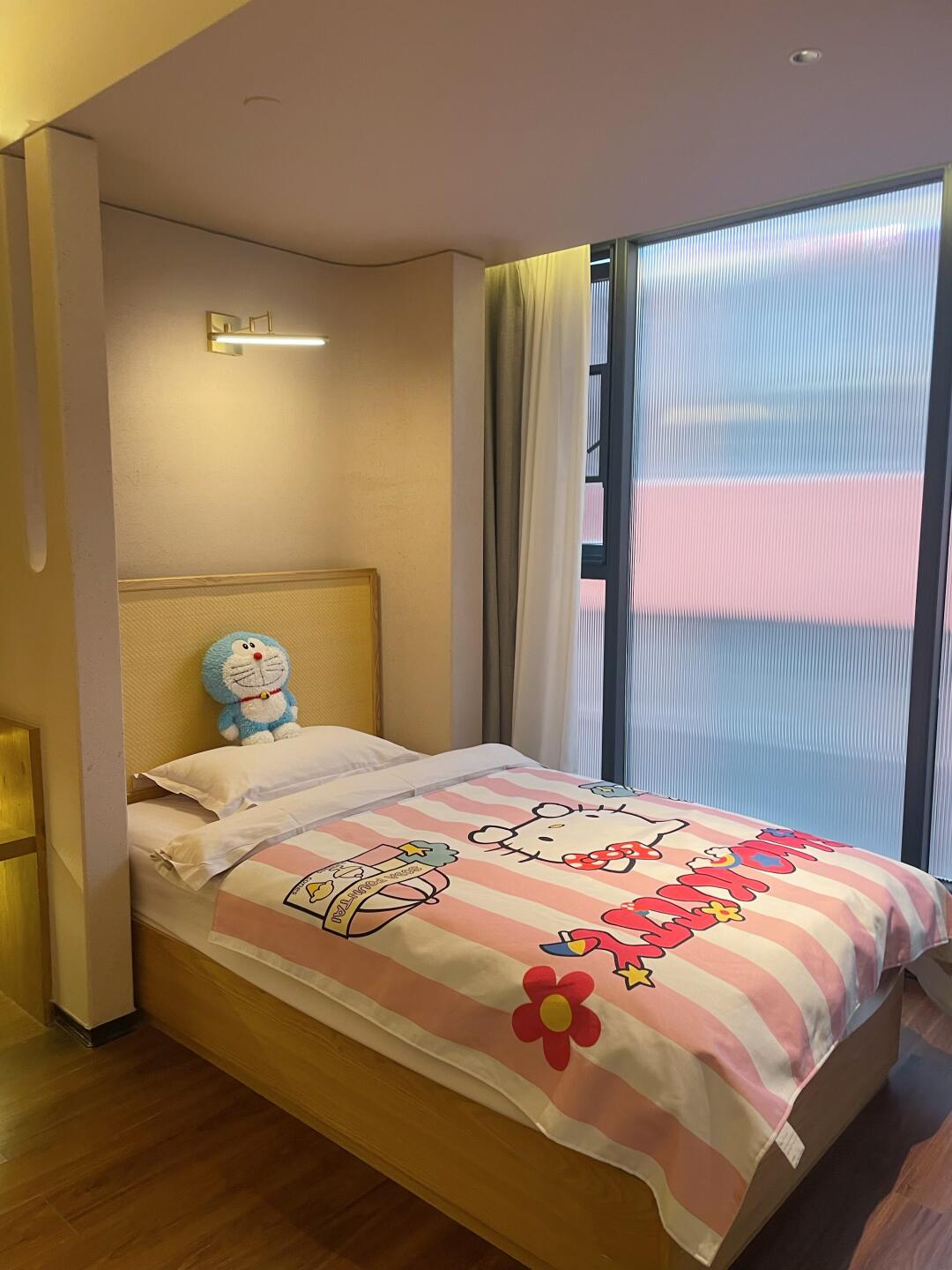 房间里智能语音控制超方便,喊一声就开窗帘、调空调🌬️。180度全景窗太绝,白天看街景,晚上躺床上看湘江灯光🌃,床品软到不想起!