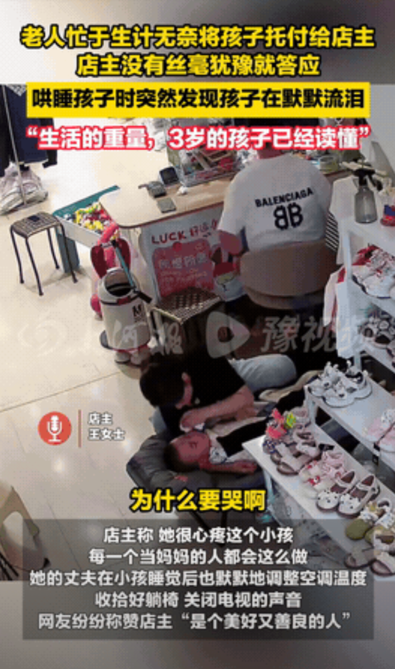 “看哭了!”安徽合肥,一奶奶带着3岁的孙子,向一家童装店老板娘求助:“能帮我看两个小时吗?”老板娘在了解情况后,才知道老人在外摆摊卖菜,因为怕孙子中暑,才提出了请求,于是她直接答应了!没想到在她哄孩子睡觉时,却看到孩子在默默地流泪!网友:懂事地让人心疼! 事发当天,合肥晌午的太阳跟火烤似的,脚踩在地上都觉得烫,此时一位挎着包的奶奶,手里牵着个矮矮的小男孩,一步步往街边的童装店挪。 到了店门口,奶奶站着愣了好一会儿,手抓着帘子掀了又放,最后才咬咬牙走进去,她走到柜台前,拉着老板娘的胳膊,说话声音都有点抖:“妹子,能不能帮我看会儿娃?就俩钟头,我在街口卖菜,天太热,怕娃待那儿中暑,实在没辙了才来麻烦你。” 老板娘抬眼一看,奶奶额头上的汗顺着脸颊往下淌,孩子小脸也晒得通红,连忙点头说“行”,转身从里屋搬了个小凳子给孩子,又翻出玩具递过去,让孩子坐着玩。 孩子特别乖,坐在小凳子上拿着玩具,安安静静的不吵也不闹,老板娘忙着整理货架上的衣服,时不时回头瞅一眼,总见孩子盯着店门外,眼神直直的,像是在盼着什么。 没过多久,店里的老板从后屋出来,看见孩子额头上还冒着细汗,没吭声就走到空调边,调了调按钮,又去里屋拿了条软软的小薄毯,铺在角落的小床上。 快到下午两点,孩子揉着眼睛打哈欠,眼皮都快耷拉下来了,老板娘见状,就把孩子抱到小床上,轻轻拍着他的背哄睡。 刚拍了没几下,老板娘忽然发现,孩子的眼角往下掉眼泪,不是那种哇哇哭的闹,就是安安静静的,泪珠顺着小脸蛋往下滚,老板娘赶紧停下动作,把孩子往怀里搂了搂,就那么轻轻拍着,没说话。 后来这事被发到网上,好多网友都说,看孩子默默掉眼泪那下,心都揪起来了,才3岁的孩子,居然能懂奶奶卖菜的辛苦,店主夫妇倒觉得没什么,就说自己也有娃,看见别家孩子受委屈,哪能不管,帮把手是应该的。 生活里哪有那么多惊天动地的事,大多都是这样的小事,店主夫妇没图啥回报,就凭着自己当爸妈的那份心,奶奶顶着大太阳卖菜,也是想多挣点钱,让孩子过得好点,孩子虽小,却把大人的难都看在了眼里,这样的事,看着让人心里踏实,可一想到那孩子掉眼泪的模样,又忍不住鼻酸。 要是换作你,走在路上碰到有人像这位奶奶一样,带着孩子求你帮忙看一会儿,你会怎么选呢?