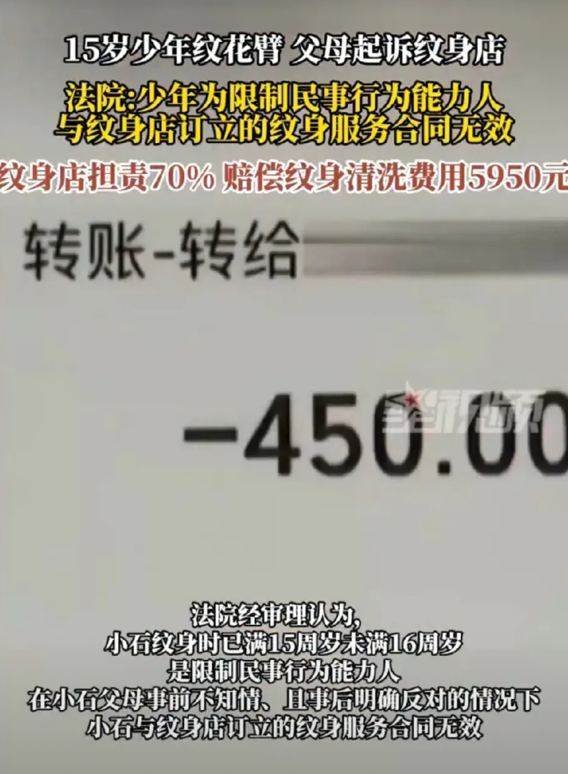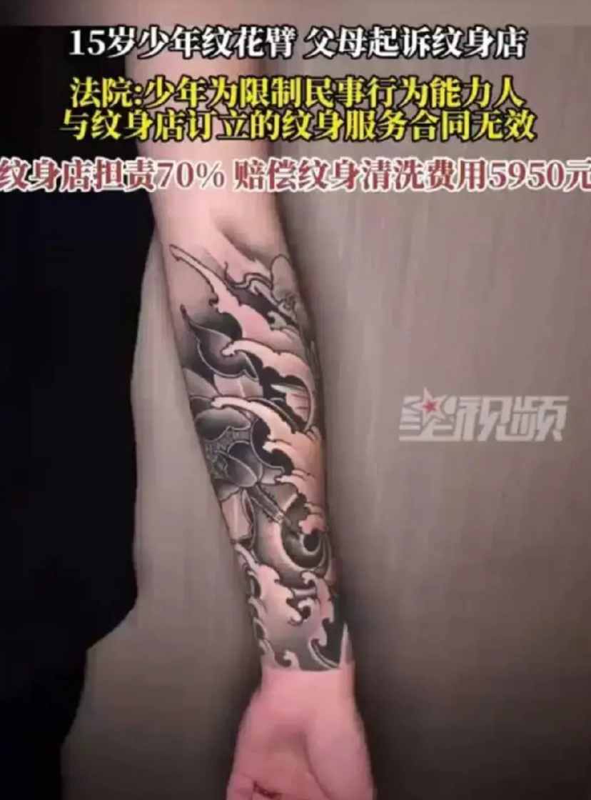 江苏,15岁男孩花了450元纹了手臂,男孩父母发现后,花了8500元激光清洗。他们越想越气,认为孩子受到纹身店忽悠,向纹身店索赔损失。遭到拒绝后,一纸诉状将纹身店告上法院,法院这样判! “赔钱!他一个小孩子懂什么啊!你们也敢给他纹身,为了赚钱良心都不要了!” 一位母亲愤怒的声音在一家纹身店响了起来。15 岁的男孩小宇(化名)也没想到自己就是想着在手臂纹个图案 “耍酷”,结果惹来了这么大的麻烦! 小宇平时在学校里,就是那种活泼好动、喜欢追求 “个性” 的孩子,看到身边有同学偶尔露出新奇的纹身贴纸,心里早就痒痒的。那天放学后,他没直接回家,而是被同学拉去了纹身店。 走进店里,看着墙上花花绿绿的纹身图案,小宇瞬间被吸引。纹身师问他年龄,他含糊其词,想着能蒙混过去,就这么稀里糊涂地坐在了纹身椅上,花 450 元在手臂纹了个图案。 等到父母发现时,图案已经清晰地刻在小宇手臂上。父母又气又急,气孩子不懂事,更急这纹身可能给孩子未来带来的影响 —— 毕竟小宇还没成年,往后上学、找工作,好多地方对纹身有要求。 他们赶紧带小宇去做激光清洗,一次次的激光治疗,不仅疼在小宇身上,也 “烧” 钱在父母心里,前前后后花了 8500 元 。 越想越觉得憋屈的父母,认定是纹身店不负责任,没核实孩子年龄就给纹身,这才导致后续一系列麻烦。他们找到纹身店,要求对方承担清洗费用,可纹身店觉得,是孩子自己要来纹身,拒绝赔偿。 双方吵得不可开交,小宇父母一咬牙,把纹身店告上了法院。 法院审理时,发现小宇纹身时才 15 岁,属于限制民事行为能力人,他独自做的纹身决定,在父母没追认、还明确反对的情况下,这份纹身服务合同是无效的。但是纹身店也有大问题,给未成年人纹身,没尽到核实年龄的责任,这是明显的过错。 最终,法院判定纹身店得承担 70% 的责任。纹身店得返还小宇 450 元纹身费,还得赔偿 5950 元清洗费 。 这事在网上一传开,网友们炸开了锅。 有人说:“应该出台法律,对给未满18周岁人纹身者,罚款10万元起步,未满14岁者,除罚款外,再加一年以上有期徒刑。纹身真是害人不浅。” 也有人念叨:“当父母的也得留心,孩子叛逆期得看好,不然出了事追悔莫及。” 从这事里,大家也悟出不少道理。对商家来说,做生意得守规矩,尤其是涉及未成年人的服务,必须严格审核,不然赚了小钱,吃了大亏,还坏了名声。 对家长而言,得盯紧孩子成长,叛逆期的孩子冲动又好奇,得好好引导,别等出了状况才追悔。我们也得明白,法律会给权益兜底,但生活里多份谨慎、多份责任,才能少点纠纷、少点糟心事儿。 对于这件事情,你们怎么看?