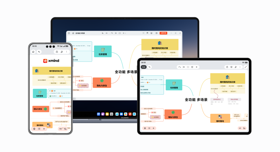 不管是通勤时用手机随手记下灵感框架,午休时用平板调整分支结构,还是回到工位打开鸿蒙电脑做深度细化,只要在不同设备上登录同一个Xmind账号,所有内容都会实时同步。刚在手机上标注的重点、平板上调整的层级,电脑端立马同步呈现,连字体、颜色、备注都分毫不差,三端实时同步,创作节奏完全不被打断。