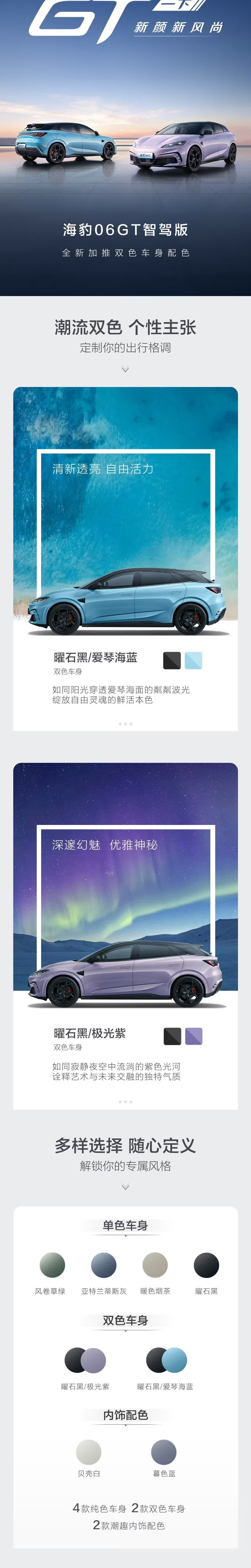 比亚迪:海豹有双色车身了! 就在刚才,比亚迪的官方社交网络放出来一张新的海报,这一次专门弄了一个海豹06GT的版本! 这个版本他不但在性能上面提升了,而且还专门推出了两种颜色的双拼搭配,一个是蓝色和黑色的搭配,一个是紫色和黑色的搭配! 根据他下面这个长途的详细介绍,还有其他四种颜色,也可以组合搭配,当然你也可以选择纯颜色的! 估计他这样是想吸引一部分女性用户来,毕竟海豹系列一直都卖得不错,现在搞一个动力稍微好一点颜色多元化的,这种策略也可以! 不过他们还是太低调了,人家搞双拼颜色,会大张旗鼓的宣传,他们就是在官方发海报,这个事儿就算完成了[捂脸]