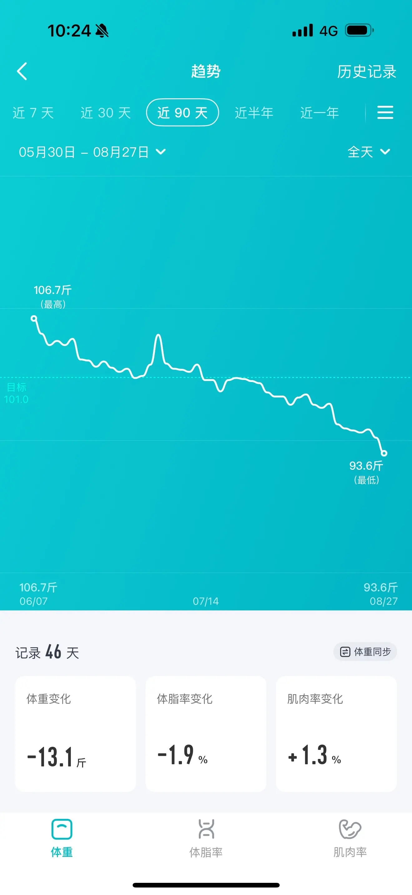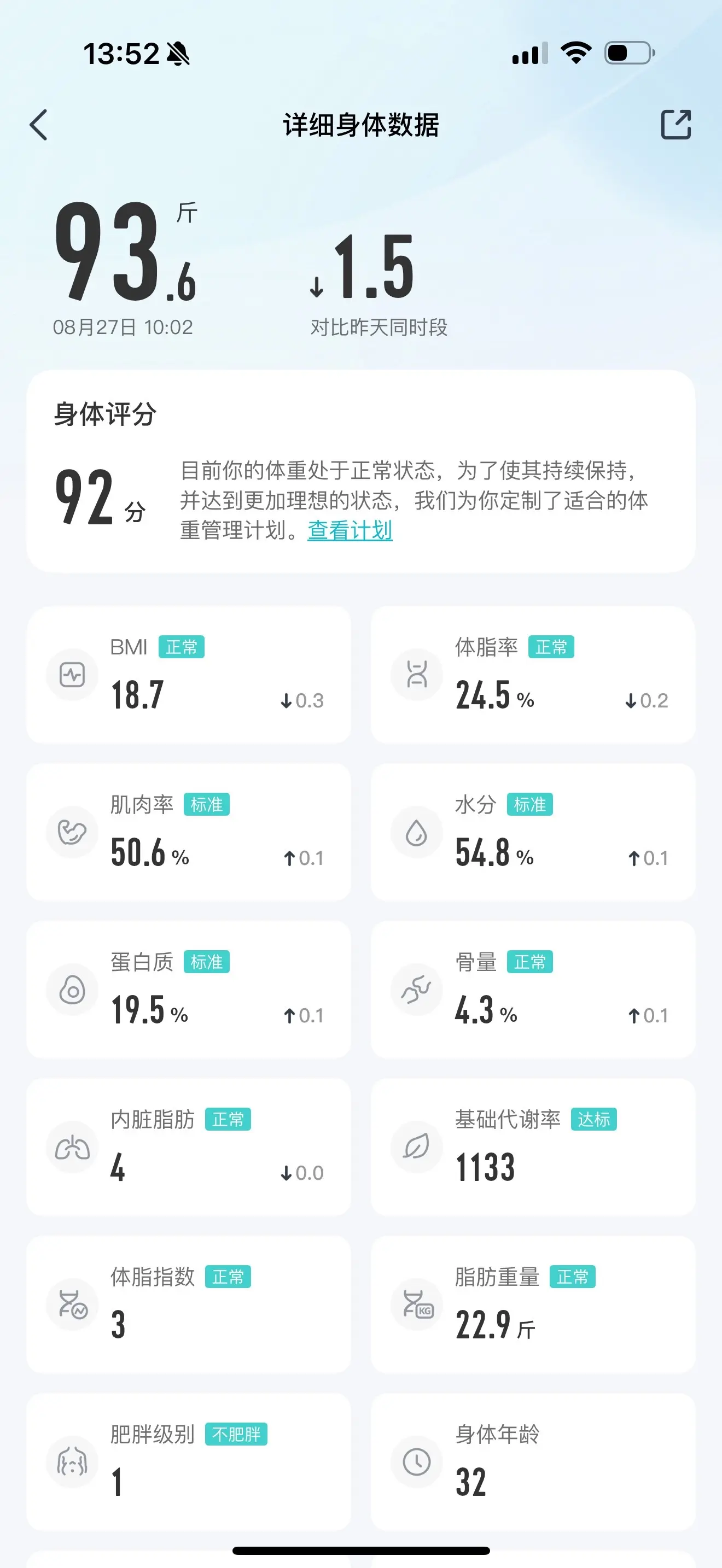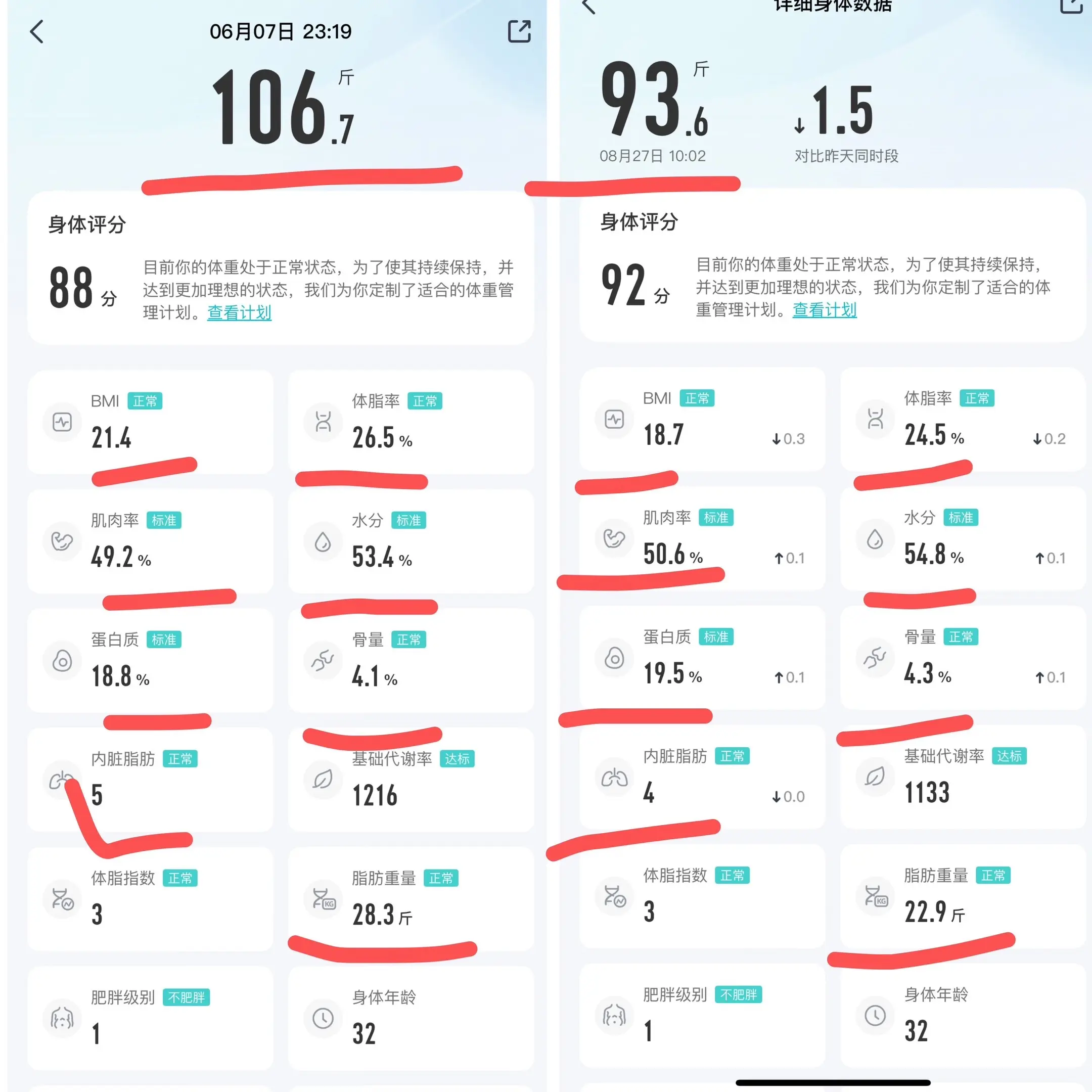 体重⬇️13.1个 BM I⬇️2.7个 体脂率⬇️2个 内脏脂肪⬇️1个 脂肪重量⬇️5.4个 骨量涨了⬆️0.2个 蛋白质涨⬆️0.7个 水分涨了⬆️1.4个 肌肉率涨了⬆️1.4个 这么漂亮的数据📈你都不心动吗?坚持的意义
