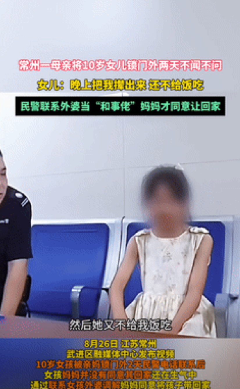 心可太狠了!江苏常州,一10岁女孩被亲妈锁门外两天不闻不问,民警电话联系时,亲妈还不肯让女孩回家,无奈之下,民警只好联系外婆,亲妈这才同意,不料,当她见到女孩后说的一句话,却让网友们十分生气! 据颍淮新闻8月27日的报道,这件事情发生在常州,女孩被赶出来的时候,刚好还是大晚上,睡觉只好去公寓前台凑合着睡。 而在第二天的时候,其母亲也没来找过女孩,身无分文的她,就这样饿了一整天,等到晚上才遇到了要外出吃饭的母亲。 可对方的态度,却让人很生气,不仅没有给女孩东西吃,甚至当她跟着上楼时,母亲依旧将其锁在外面。 直到后面有热心群众发现后,急忙报警求助警察,当了解到具体情况后,民警也感到有些生气。 毕竟这么小的孩子,再怎么样也不能锁外面两天都不闻不问的,于是就给其母亲打电话,结果她还是不肯让女孩回家。 无奈之下,民警只好联系外婆,让她充当一下和事佬,在外婆的劝说下,母亲才点头同意让女孩回去。 不过当民警把女孩交到她手里后,其母亲说的一句话,却不是担心而是责怪,说:你还报警呢,长本事了! 该说不说,这妈当的真够绝的,完全不在意孩子的安危,要是孩子真出现什么意外,可有她后悔的时候,希望她能认识到自己的错误。 那么对于这件事情,您有什么想说的呢?