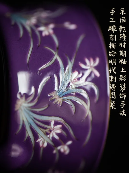 紫地为底,兰姿清逸,纹样取自明代刺绣衣饰,釉上彩绘复刻乾隆华彩,让古代服饰美学与贵气紫釉在炉上重生。