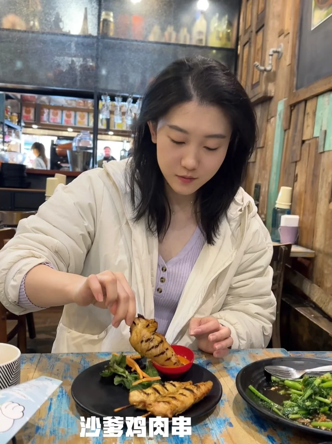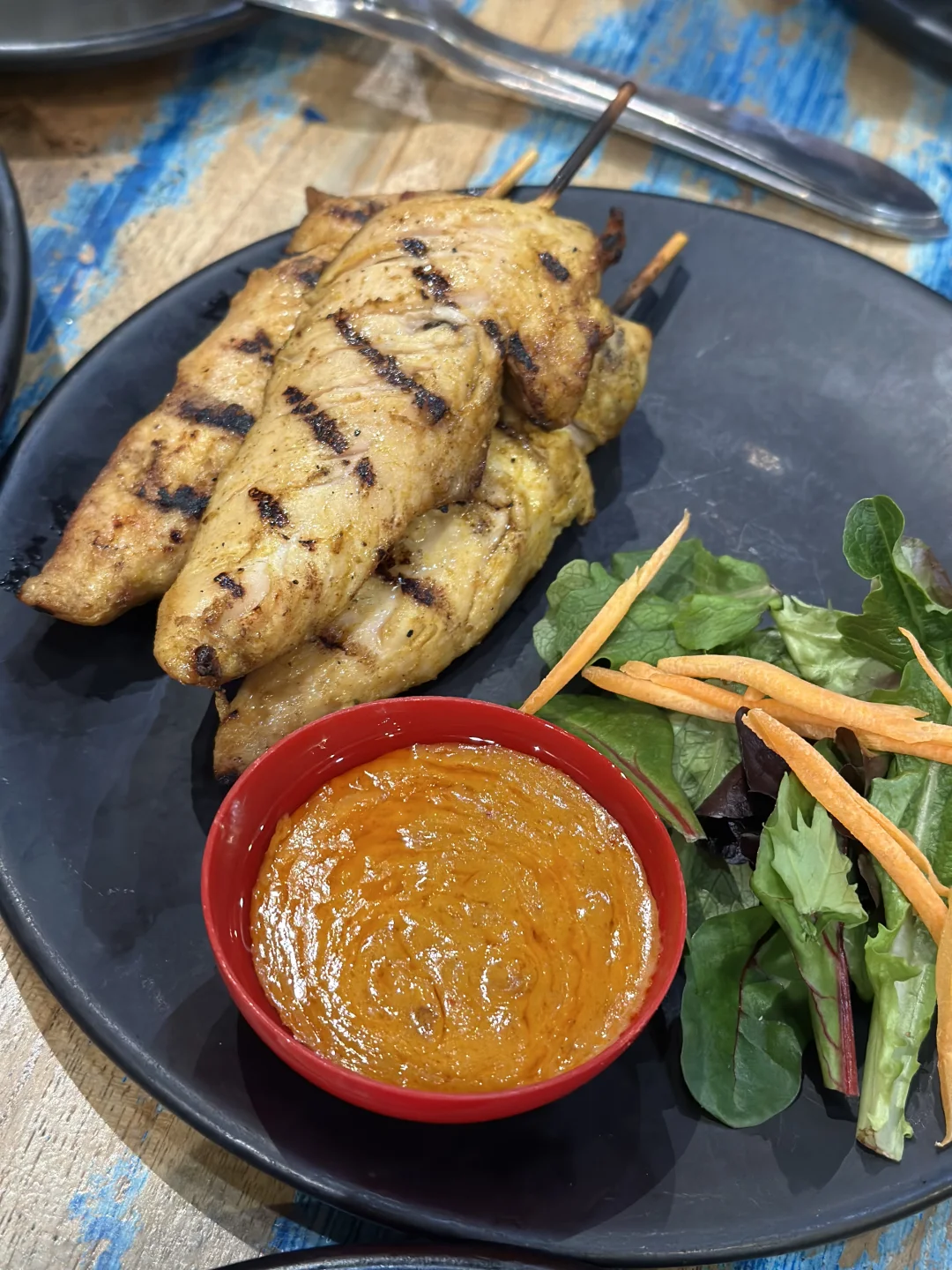 🍢 烤鸡肉串 —— 鸡肉嫩不柴,配沙爹酱刚刚好。