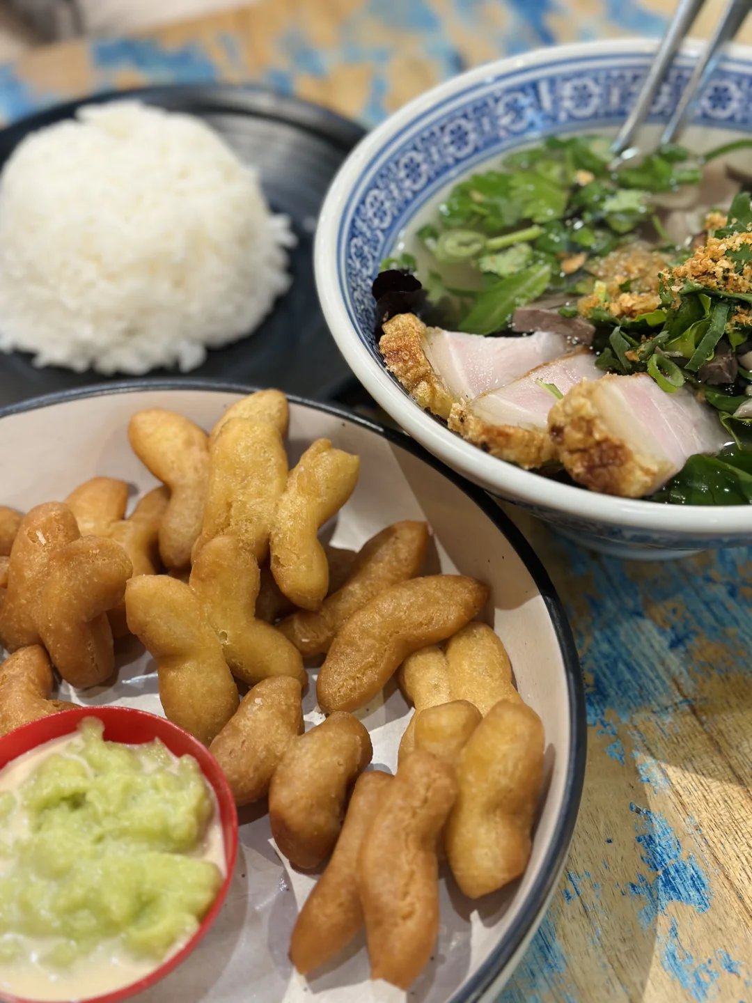 🥖 泰式炸油条 —— 蘸斑斓酱和炼乳,甜甜的很治愈,虽然下雨天上桌有点凉,但偶尔当作运动员的小零食刚刚好。