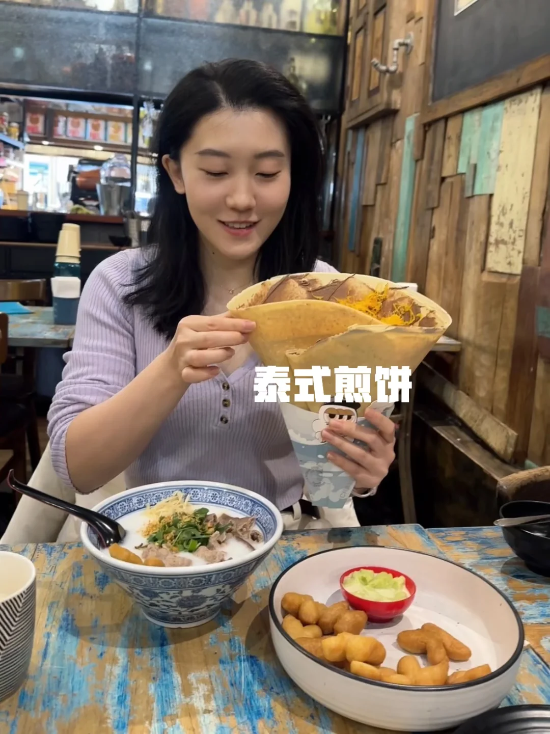 店门口也有很多泰式小吃,买了现做的超大泰式煎饼,脆脆的饼皮搭配Nutella,很多馅料选择!