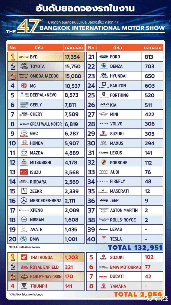 曼谷车展销量排行(数据来源:曼谷车展主办机构Grand Prix International Public Company Limited)