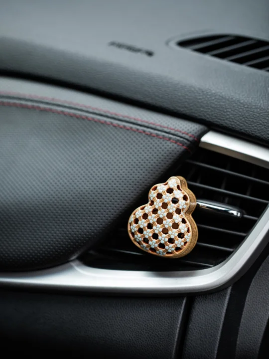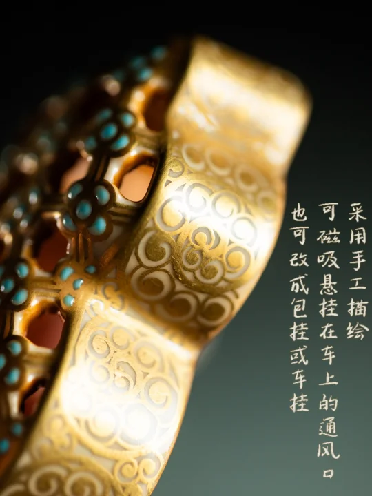 葫形香囊悬于风口,松石绿衬金彩贵气天成,磁吸稳挂车中,亦可系绳为包坠,让福禄随身而行,香随轮转。