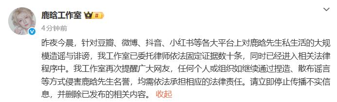 对此,多位明星工作室火速辟谣。鹿晗工作室发文:“昨夜今晨,针对豆瓣、微博、抖音、小红书等各大平台上对鹿晗先生私生活的大规模造谣与诽谤,我工作室已委托律师依法固定证据数十条,同时已经进入相关法律程序中。我工作室再次提醒广大网友,任何个人或组织如继续通过捏造、散布谣言等方式侵害鹿晗先生名誉,均需依法承担相应的法律责任。请立即停止传播不实信息,并删除已发布的相关内容。”(此前报道)