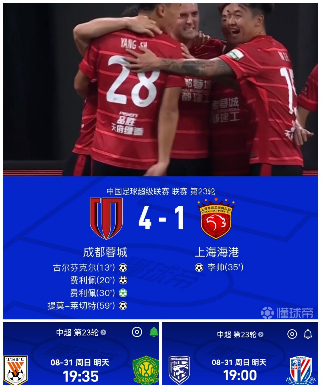不会这轮踢完中超前四又是顺子吧?国安赢申花输,然后48,49,50,51? 感觉今年中超榜首有毒啊,看看这次蓉城的榜首体验卡能坐多久。 话说成都主打一个对中下游球队唯唯诺诺,对强队重拳出击啊。真不理解这支成都是怎么被天津双杀的?要不然现在妥妥的联赛第一啊。 上港输了这场比赛,基本就无缘争冠了。这防守都不如保级队。 现在就看明天的国安和申花两家的比赛结果了。