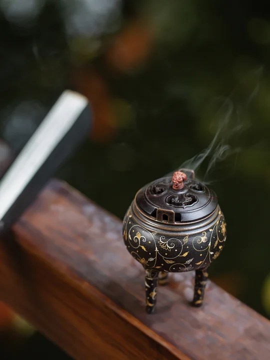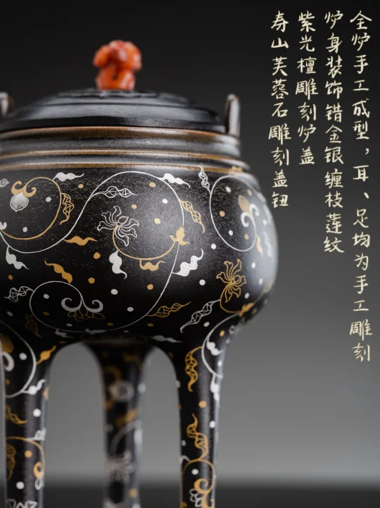 错金银缠枝莲纹从马王堆漆盒漫上炉身,仿铜黑釉底衬流转金丝,黑金交织间,连焚香都成了与时空对话的仪式。