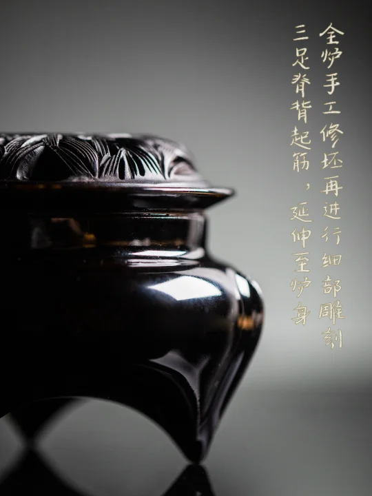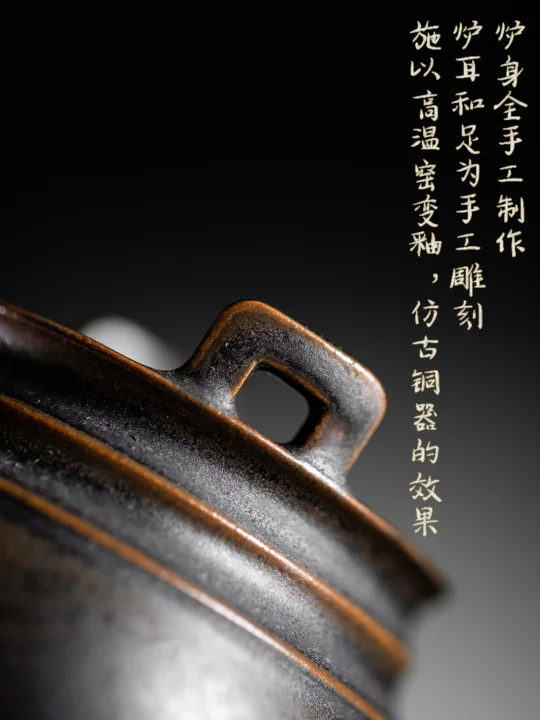 手工雕刻炉耳足,窑变釉似古铜斑驳挂霜,炉腹虽小却容得下炭火慢煎香片,黑釉沉黯如夜色,却泛着铜器阅尽千帆的温润光泽。