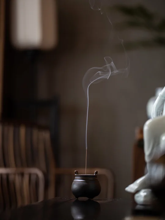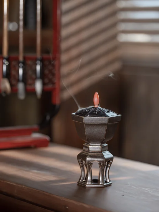 仿铁黑釉泼洒出清代铸铁的金石斑驳,高挑身姿擎起紫光檀盖,似老铁器伫立书房一隅,烟自石钮旁逸出,为工业风空间添一笔东方的静默诗行。