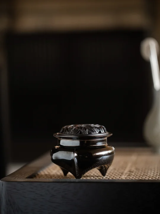 仿赣南窑系的酱黑釉裹住唐末宋初的风骨,釉色如墨滴入水,三足脊背起筋,延伸至炉身,小小一炉却凝着庄重气韵。