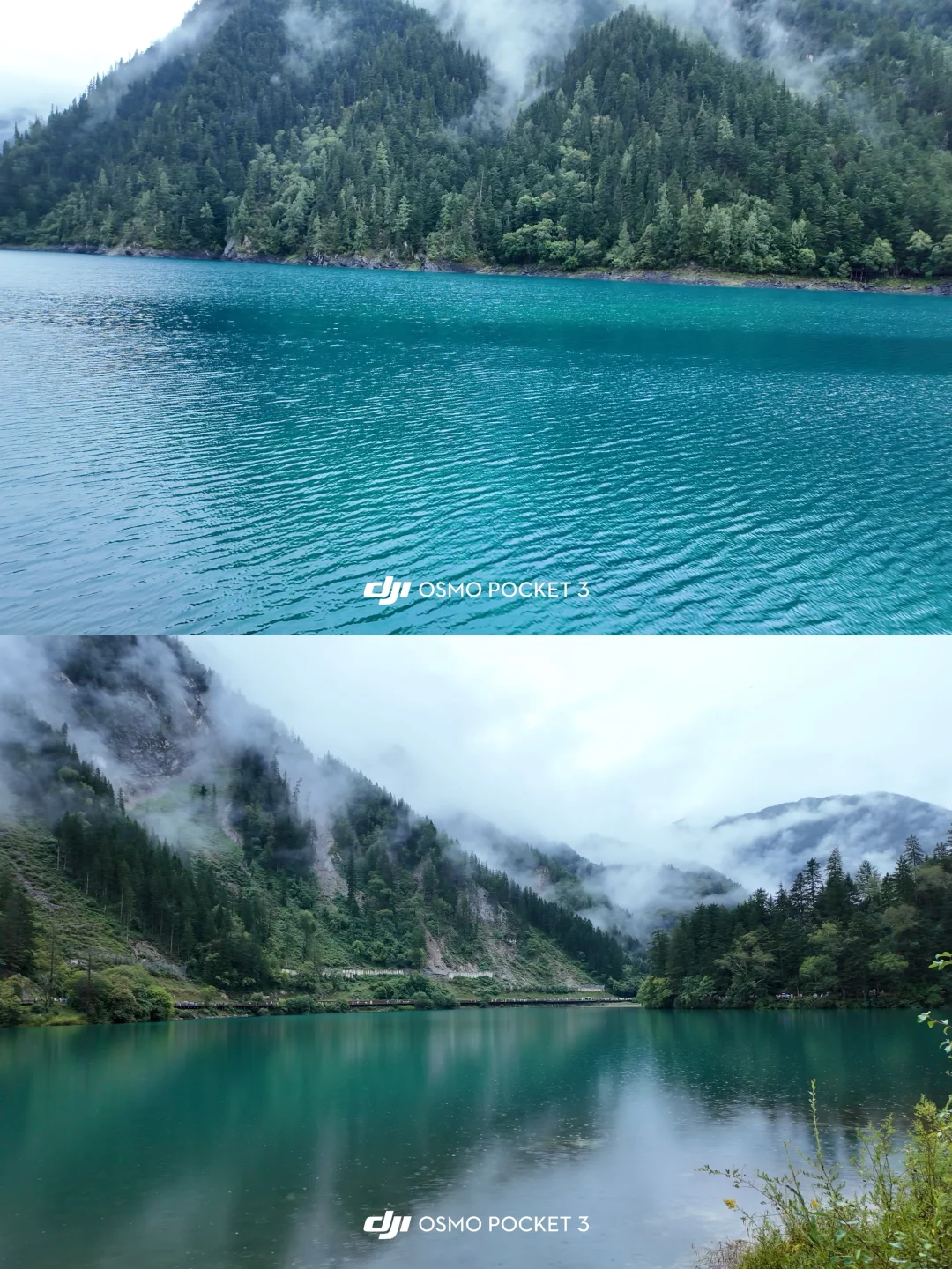 不禁感叹!pocket3拍下雨天的九寨沟也太美了!参数设置如下 1️⃣曝光Auto +0.3EV 50-3200 2️⃣白平衡M 5000K 3️⃣色彩 普通 4️⃣美颜 关