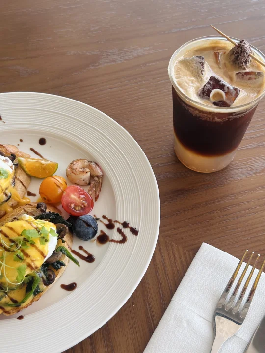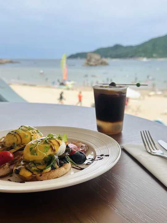 晃到村里转角时,意外撞见了一家试营业的店(The OSEA coffee),推门映入眼帘的就是海,点了份班尼尼克蛋,水波蛋戳开的瞬间,金黄的蛋液裹着全麦面包,咸香咸香,老板还额外送了一杯话梅冰美式给我,说“尝尝我们刚到的豆子,多提提意见”——没有刻意的服务话术,只有像朋友一样的真诚,让人觉得很舒服。