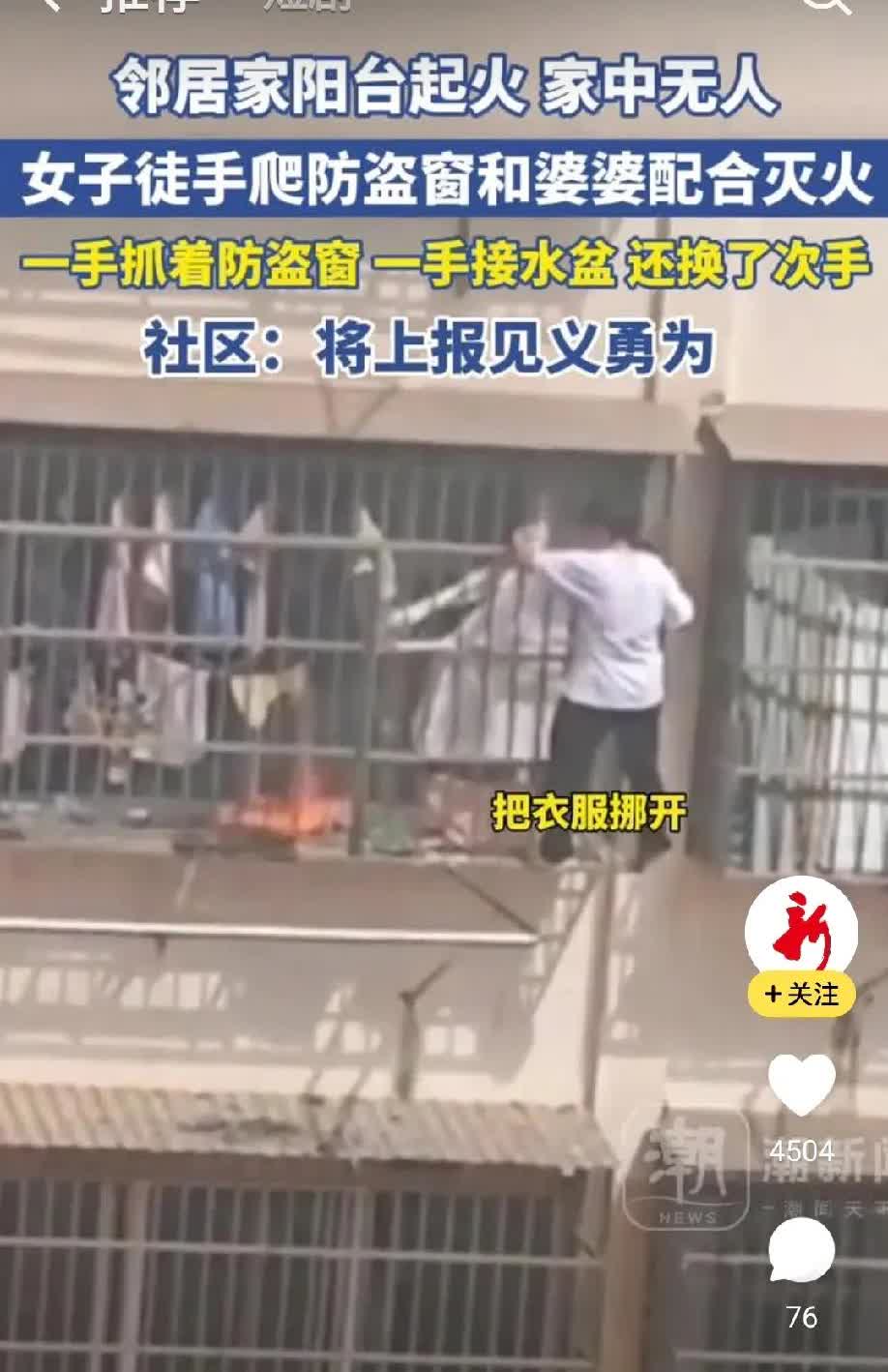 ,一手接水盆还换了次手” 我想知道她是怎么做到左右手接盆水,还要抓住栏杆的,真的是胆大心细,外加核心力量强!! 一般人做不来,上去都腿软了,更别说有勇有谋的灭火了! 必须颁发见义勇为奖励,我用我的绵薄之力曝光她的勇气可嘉,路过的朋友们给这个女英雄点个赞呗[比心] 有个好邻居真的很好,愿好人一生平安[祈祷][祈祷][祈祷]