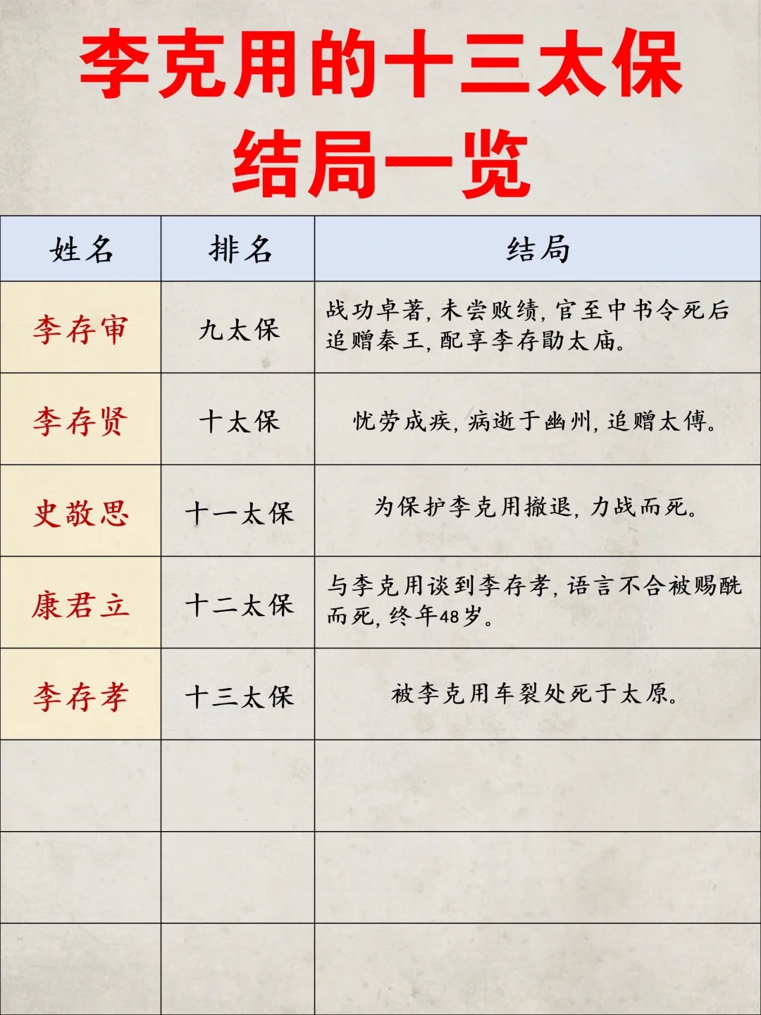 🍃号称十三太保的团体并不少见,然而,李克用麾下的十三太保名声最为卓著。 👉李克用乃唐末沙陀族杰出将领,由他的亲生子、义子以及部将十三人共同组成的十三太保,在沙场之上为李克用奋勇拼杀,攻城夺地。那么,他们各自的结局究竟如何呢? 👉值得一提的是,十三太保中的李存孝乃唐末名将,其威名与项羽相当,被赞誉为 “将不过李、王不过项”。