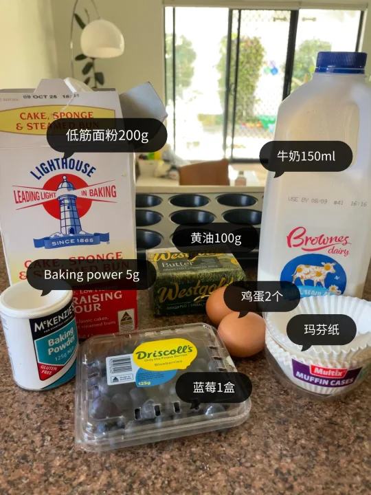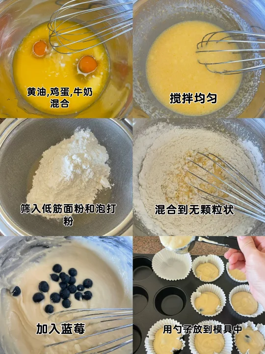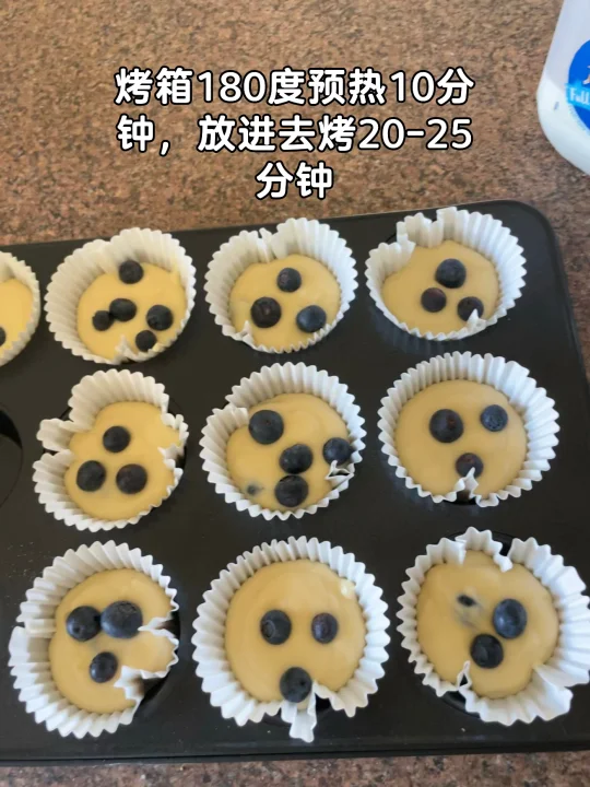 4️⃣面糊倒入模具/纸杯8分满(可撒几颗完整蓝莓装饰)