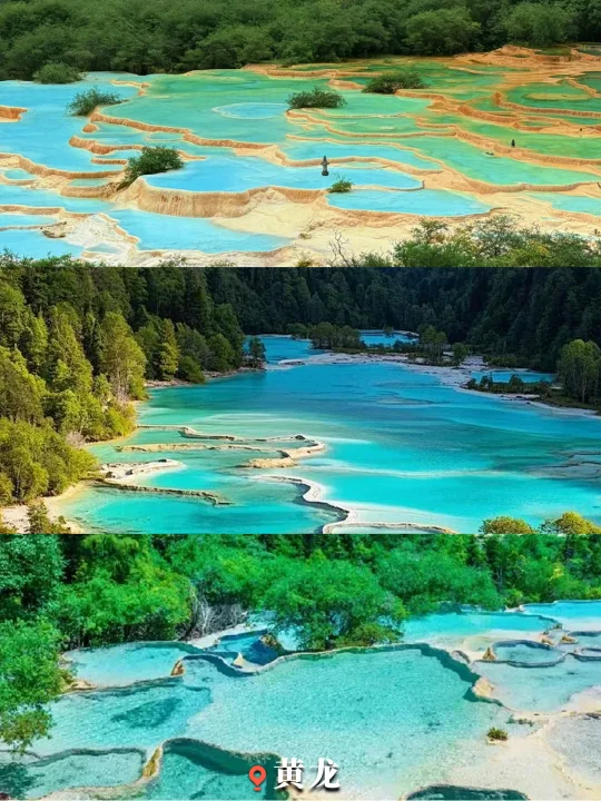 💛黄龙:人间瑶池,钙化彩池层层叠叠,在阳光照耀下闪耀着迷人的光芒,宛如仙境一般。