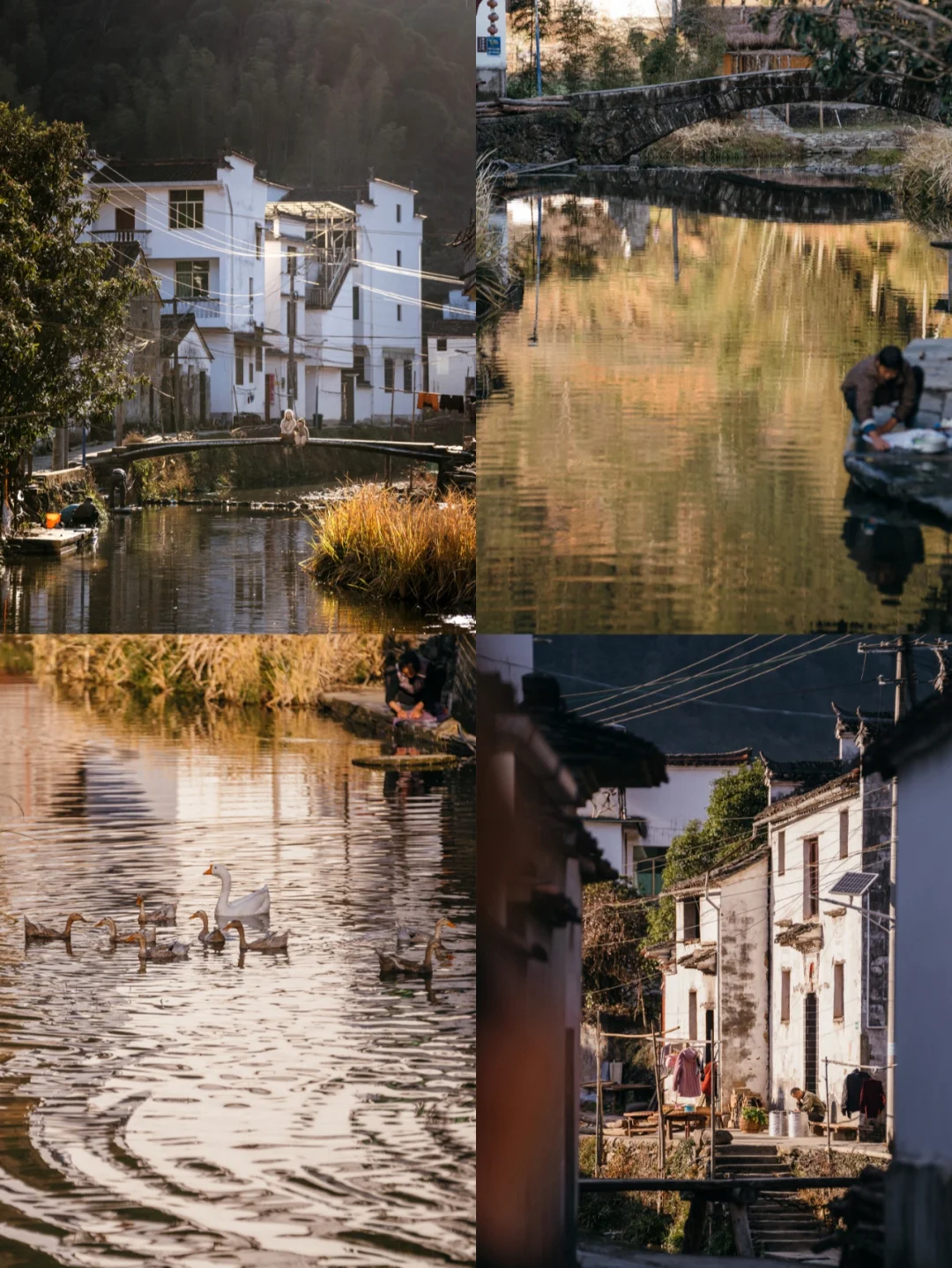 江湾溪水静静地从村前流过,溪边就是白墙灰瓦,错落有致的徽派民居。