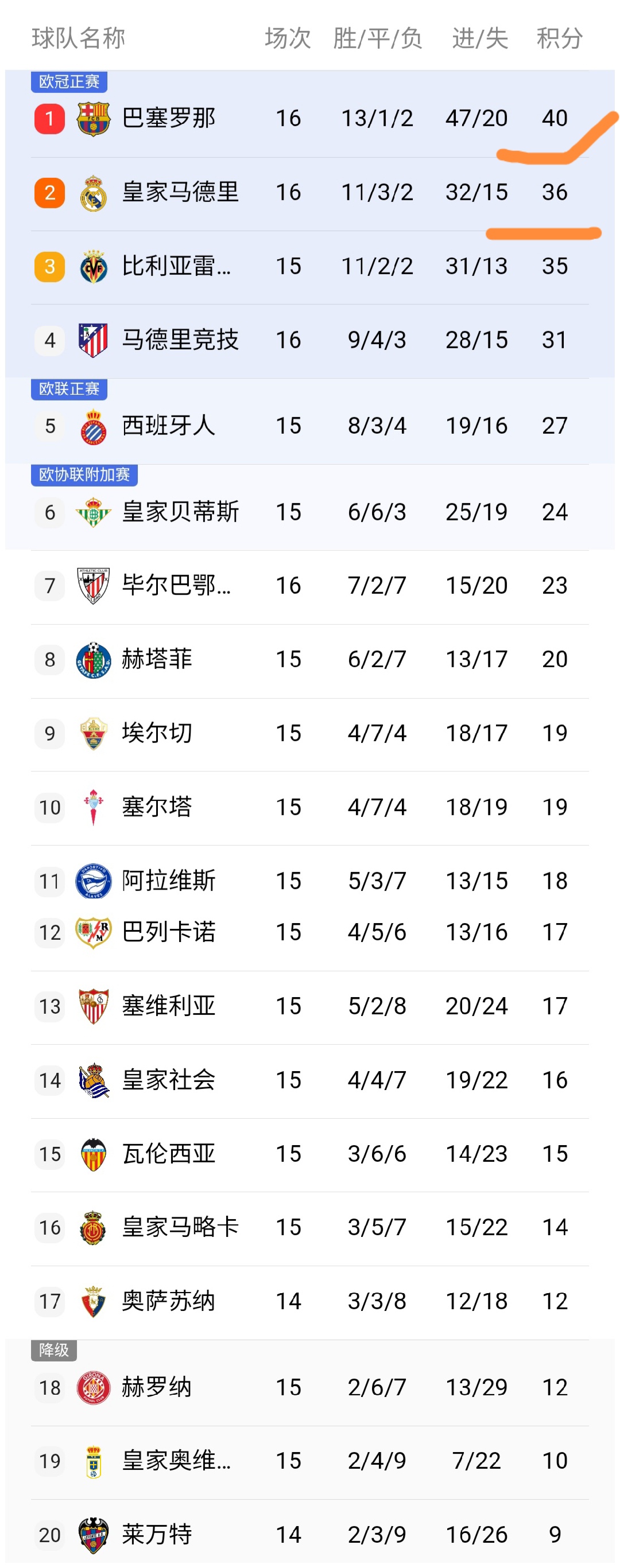 今天凌晨,皇马、西班牙人等队出战西甲第15轮的较量,比赛结束之后,西甲最新积分榜出炉,我们来看看。