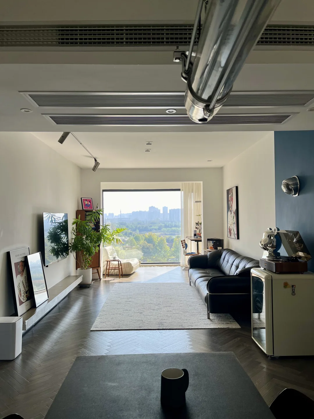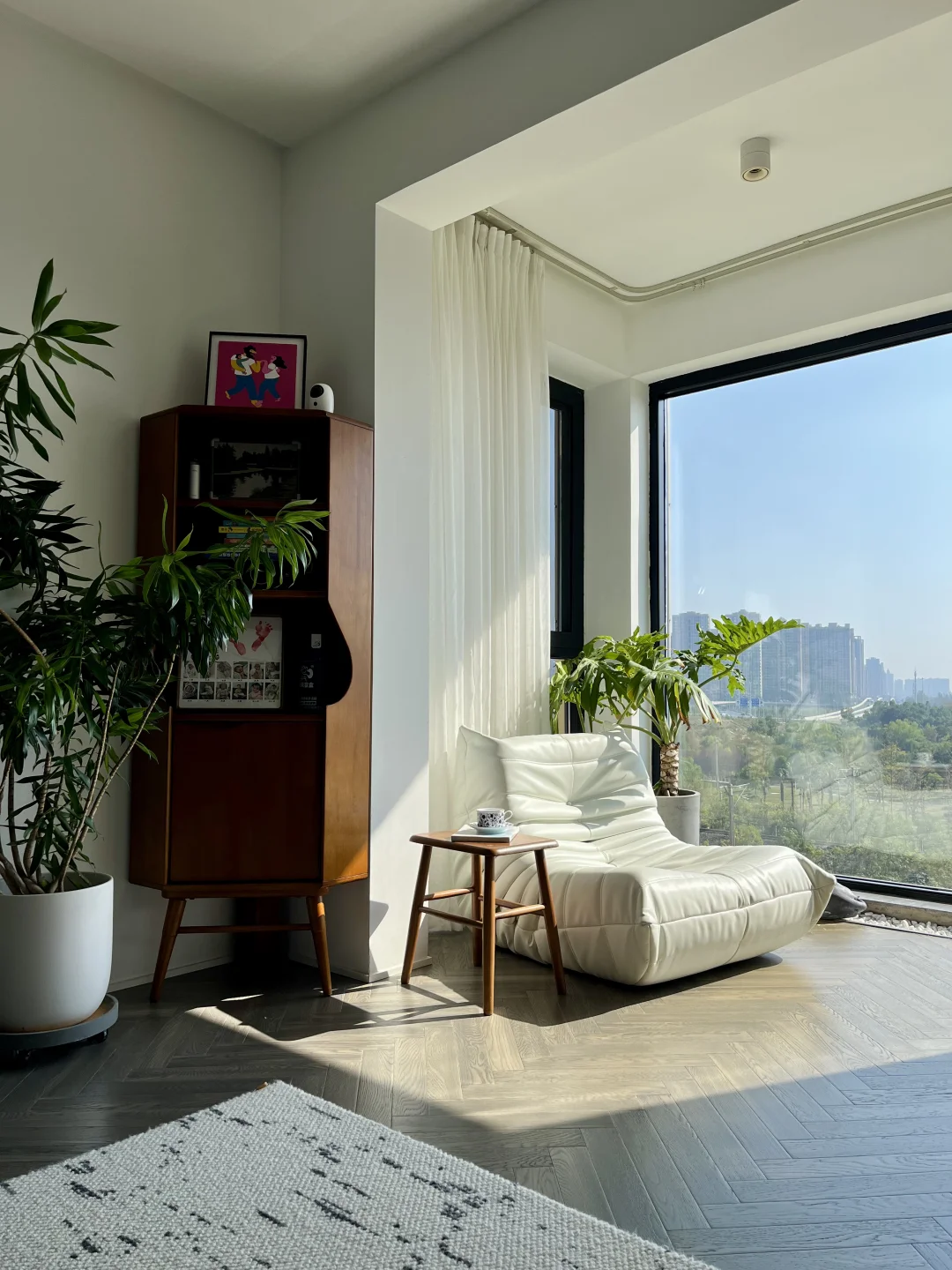 交房的时候,客厅和阳台之间是有一扇玻璃推拉门的,装修的时候我坚决拿掉,并且采用大玻璃落地窗封阳台,目的就是增加客厅进光量。营造一种屋内屋外无边界,客厅和阳台也无边界的感觉。