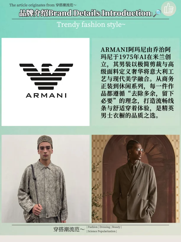 一级品牌如ARMANI阿玛尼、Brioni布里奥尼以精湛工艺定义精英质感;二级品牌如博斯绅威用功能美学平衡商务与休闲;三级品牌主打轻奢经典,四级侧重性价比基础款。真正高阶穿搭不在LOGO堆砌,而在于面料、剪裁与场景的精准匹配!