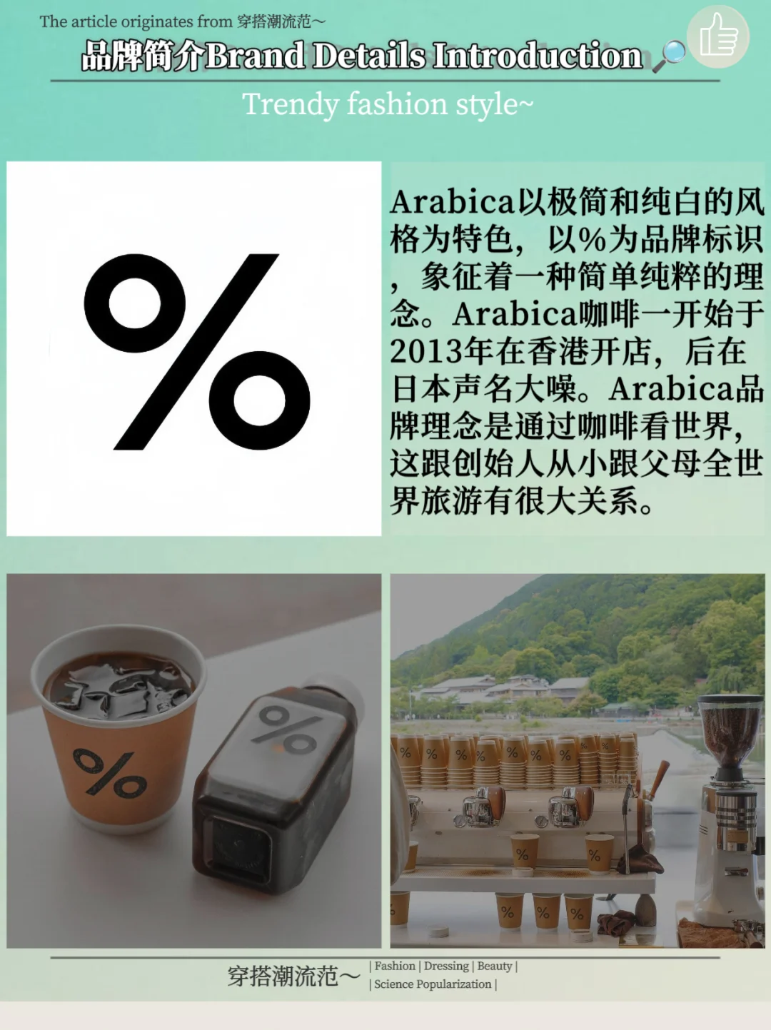 Arabica以极简和纯白的风格为特色,以%为品牌标识,象征着一种简单纯粹的理念。Arabica咖啡一开始于2013年在香港开店,后在日本声名大噪。Arabica品牌理念是通过咖啡看世界,这跟创始人从小跟父母全世界旅游有很大关系。