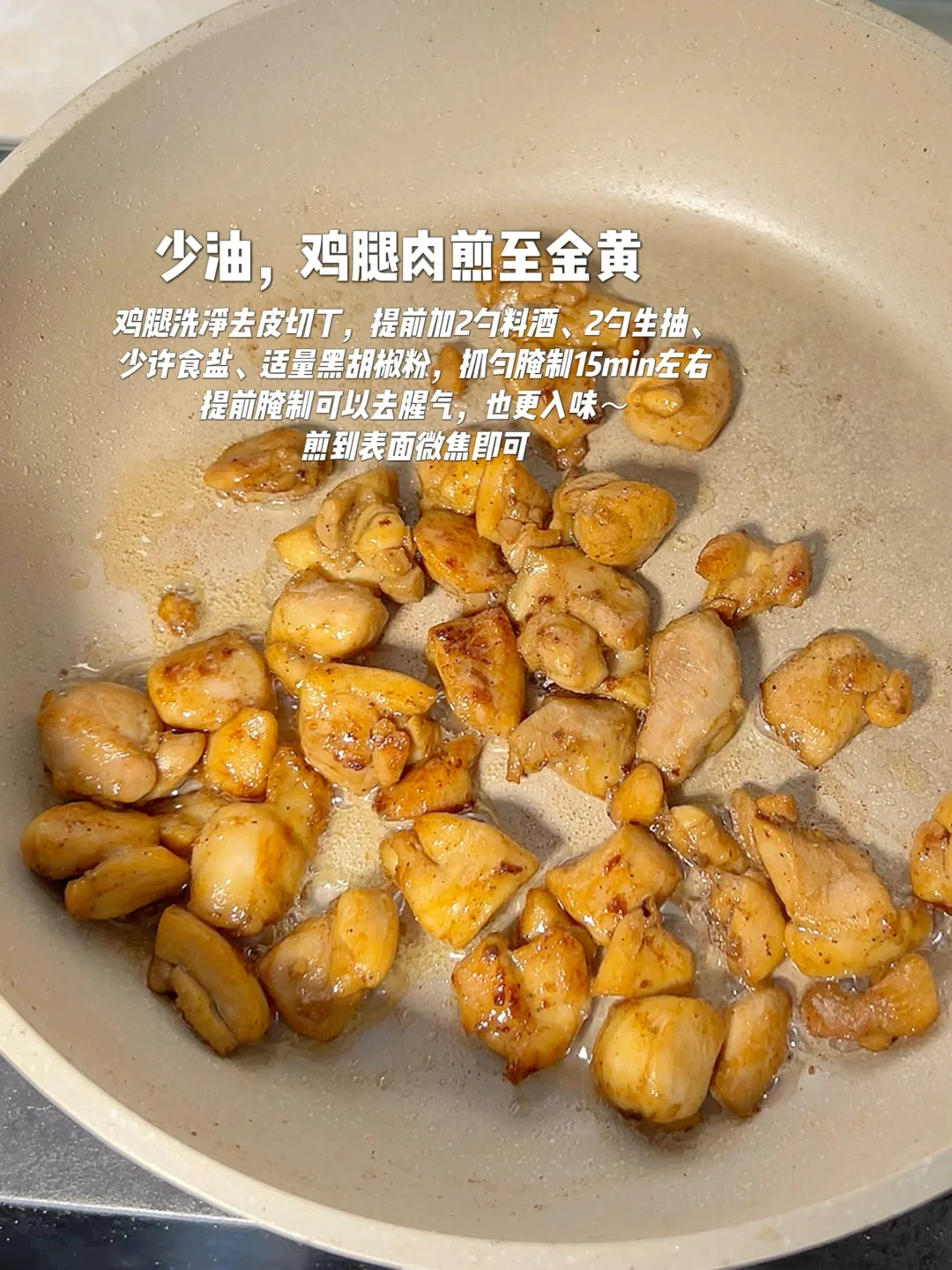 1⃣️ 鸡腿洗净去皮切丁,加2勺料酒、2勺生抽、适量黑胡椒粉、少许食盐,抓匀腌制15min左右;