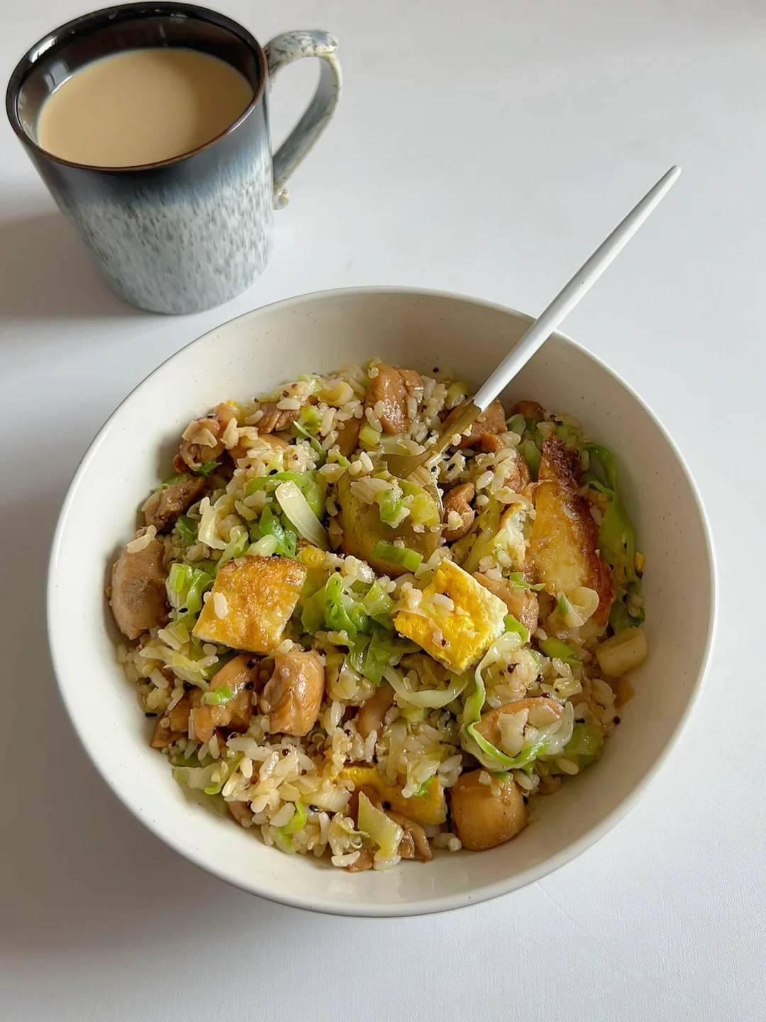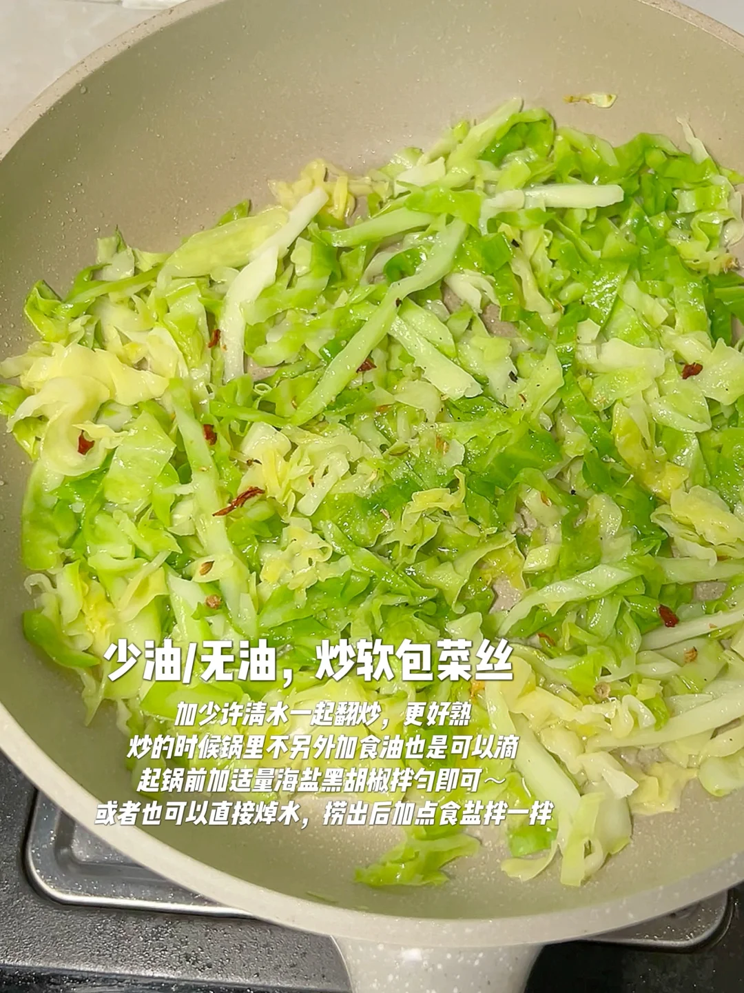 4⃣️ 锅中少油/无油,放入包菜丝和少许清水炒软,起锅前加适量海盐黑胡椒拌匀;