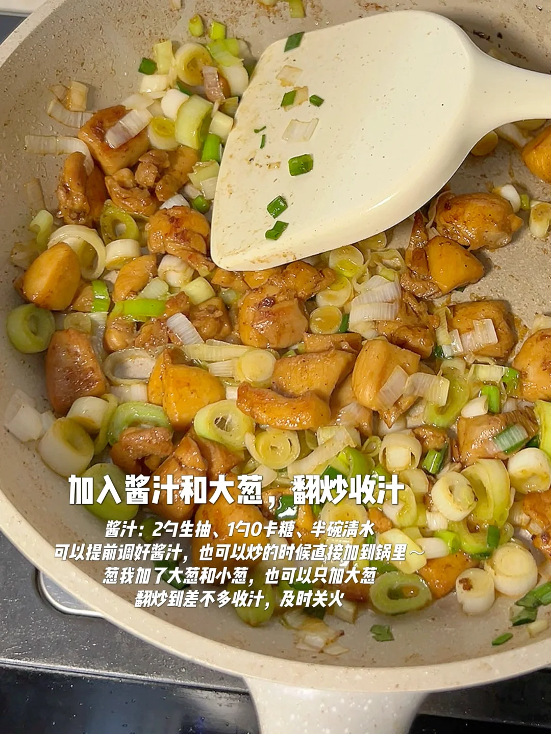 2⃣️ 锅中少油,下入鸡腿肉煎至表面金黄,然后加入2勺生抽、1勺0卡糖、半碗清水,放入大葱小葱翻炒均匀,煮到差不多收汁即可;
