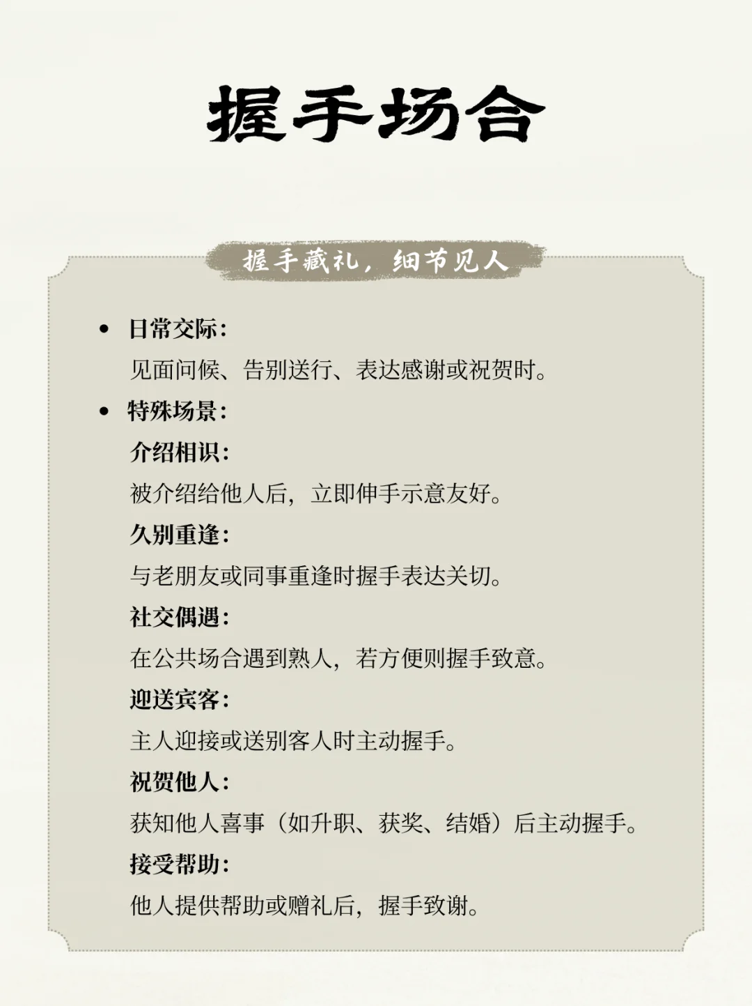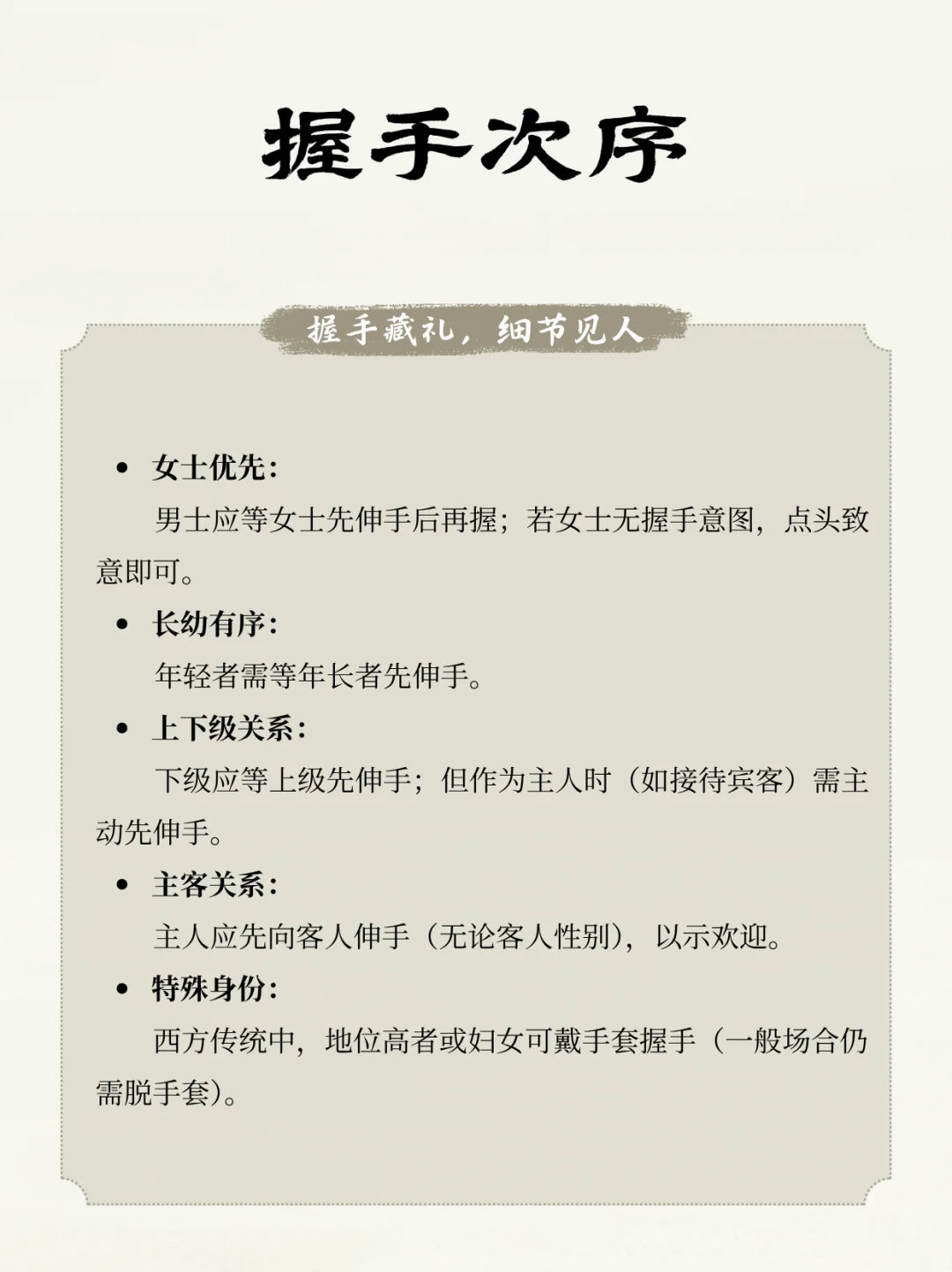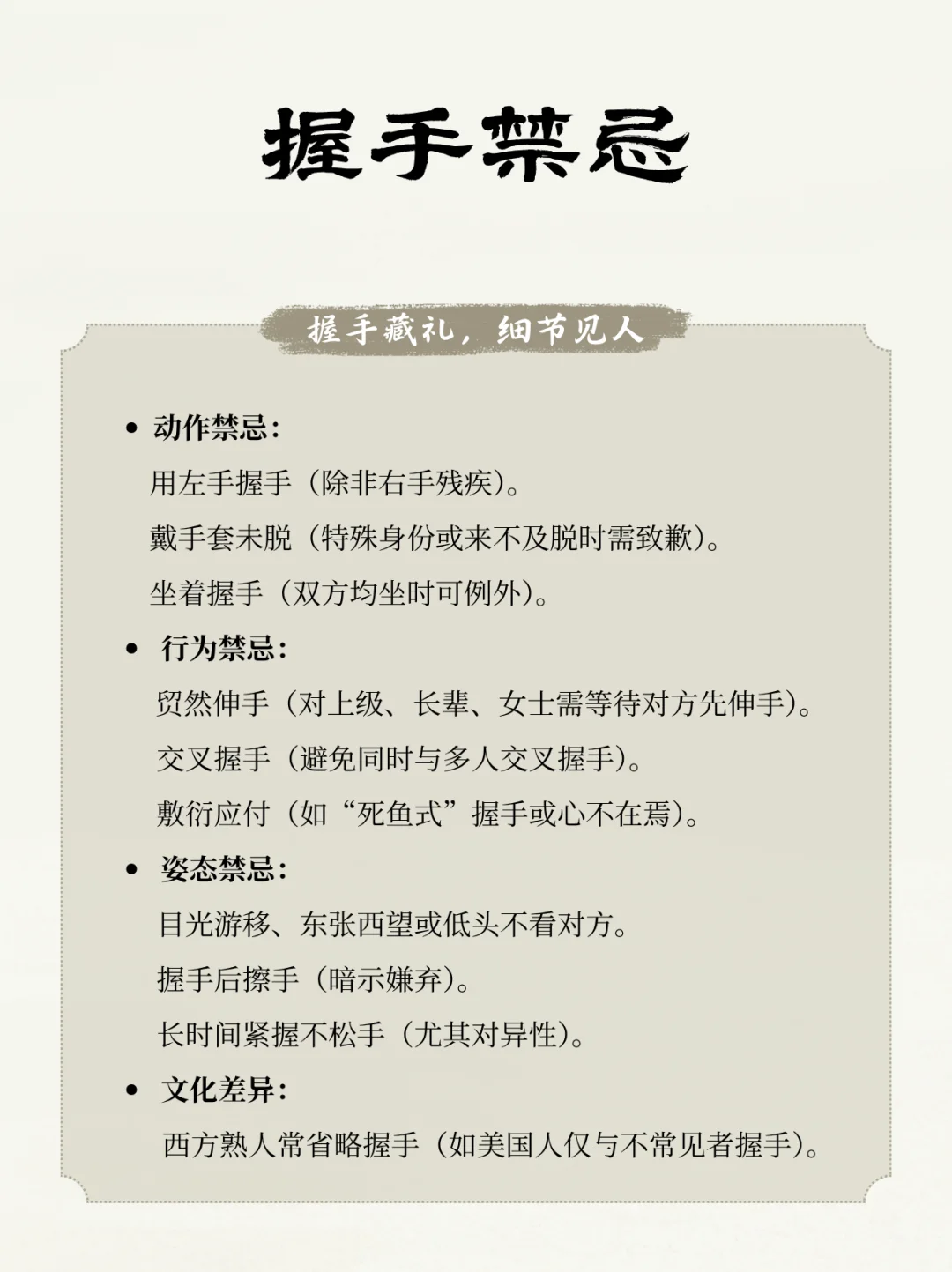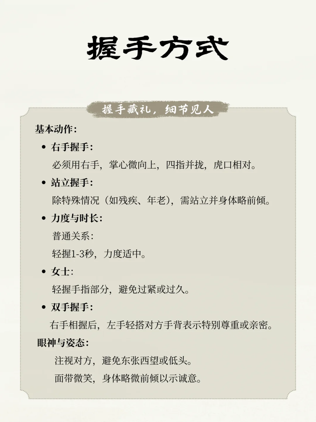✅正确姿势:虎口相对,手指自然包裹对方手掌,轻摇2-3下,力度适中。