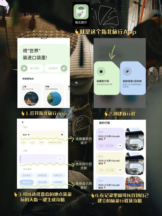 指北app可以根据行程目的地智能推荐匹配季节和当地特色的好去处,让您体验更深入的旅程~喜欢的宝可以直接复制笔记📝打开指北~一键get 同款攻略哦~