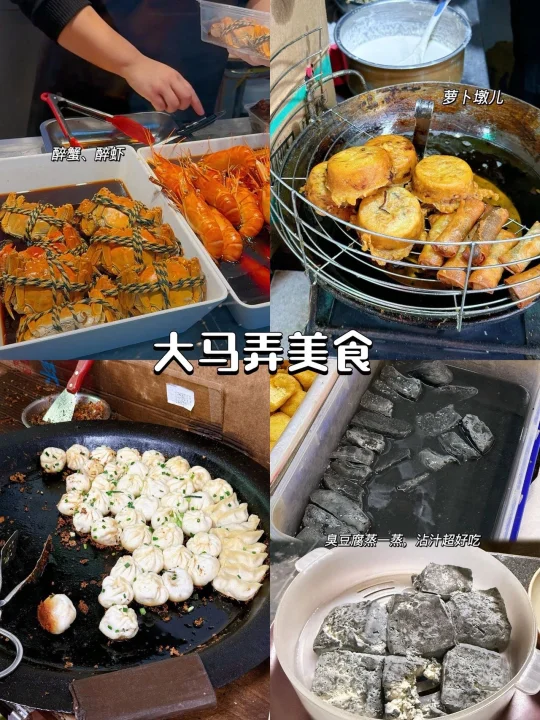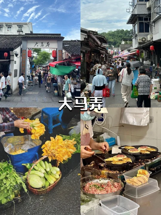 1️⃣大马弄:百年老巷里挤满了小吃摊、菜市场,锅贴、醉蟹、萝卜墩儿的香气直往鼻子里钻,是老杭州的生活缩影