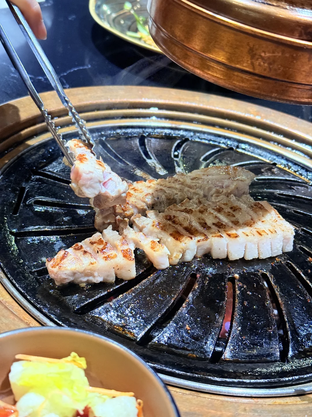 🐷吃韩式烧烤怎么能不点厚切猪五花🤪 把猪五花表皮烤到脆脆的[萌萌哒R]肉本身的油脂也会随着炭火蒸发。吃到嘴里完全不腻,搭配泡菜或者卷成菜包都超级满足!这家店仍然在free提供生菜🥬dddd
