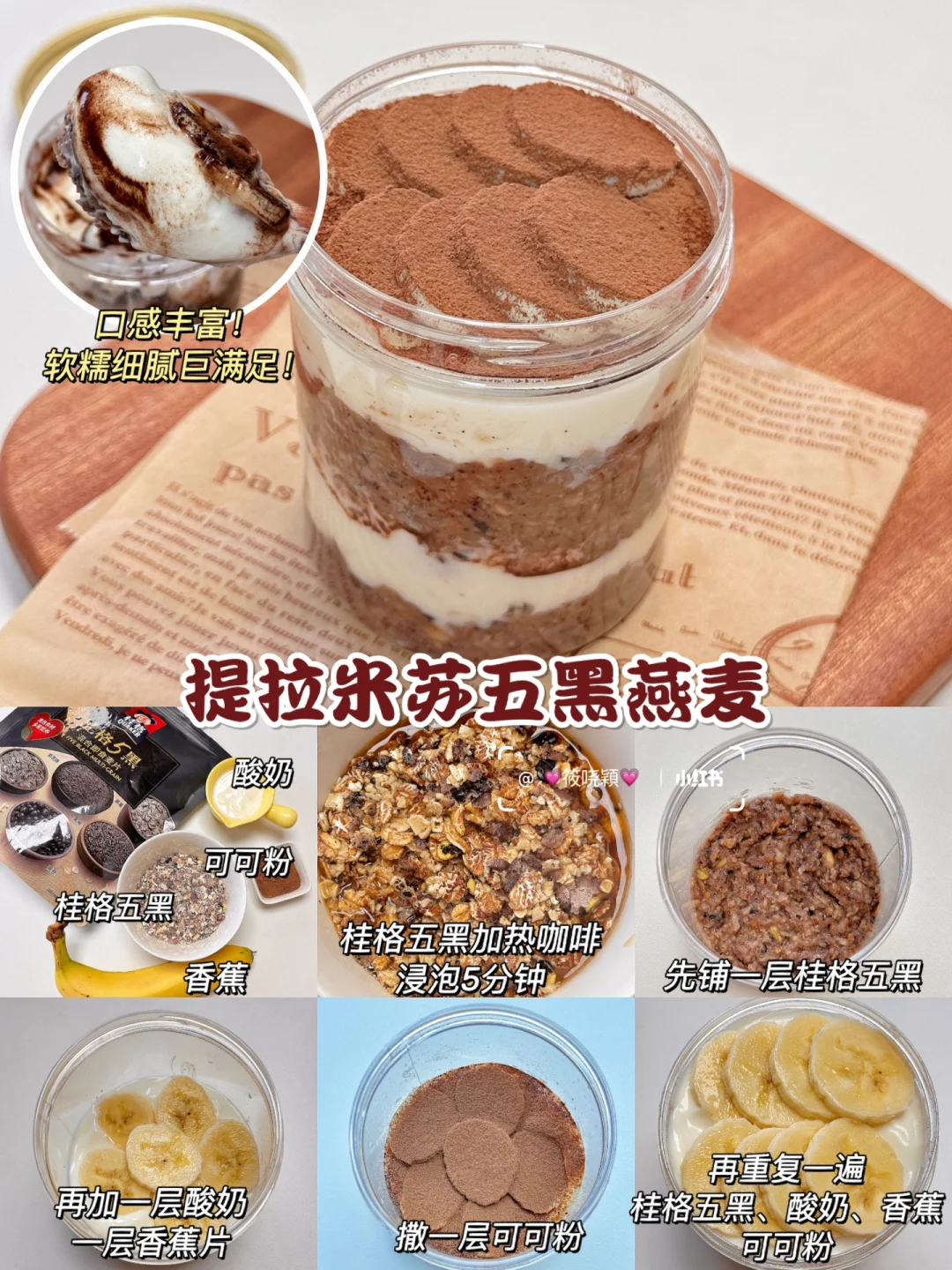 🔸桂格五黑加热咖啡浸泡3分钟,铺一层五黑麦片,加一层酸奶,放上香蕉片撒上可可粉,再重复一遍