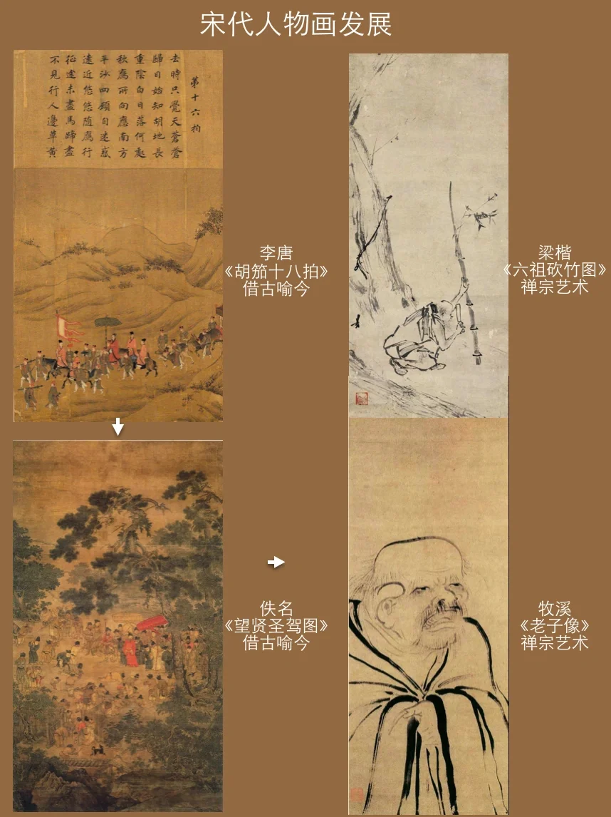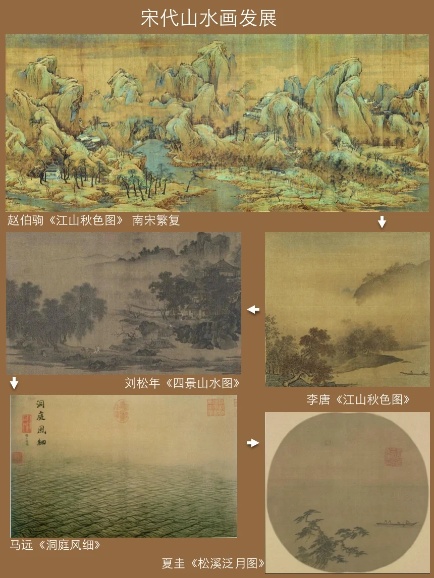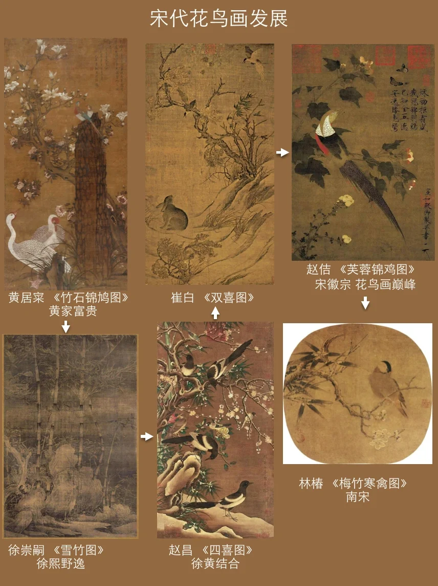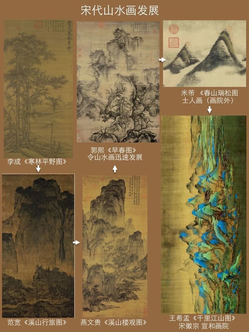 宋朝艺术之盛,在于商业繁荣、文人发达、生活风雅。 如《梦粱录》所言: 烧香点茶,挂画插花, 四般闲事,不宜累家。 而皇帝,则为其中表率。他们培养的宫廷画师,在花鸟、人物、山水领域,造诣极高。 🌺🦜先说花鸟,宋初宫廷以“黄家富贵”风为主。 百年后开始流行徐熙野逸,此后画师将二者风格相融。 崔白完全跳出“黄家”影响,摒弃浓艳,追寻野趣。 苏轼提出“士人画”概念,花鸟从此“诗中有画,画中有诗” 宋徽宗挥笔《芙蓉锦鸡图》,将画风转为清新灵动。 可能由他人代笔的《瑞鹤图》暗藏徽宗对道教的沉迷。 进入南宋,梅兰竹菊成为士人画中常客。 👯‍♀️再说人物,宋初人物画以宗教人物为主。 到了中期,李公麟的白描,将主题转向文人生活。 “市井”、“民俗”等题材也广泛受到关注。 南渡后,宫廷画院历史人物画兴起,常有借史表今之作。 同时,画院外的梁楷、牧溪将禅宗与“士人画”结合。 摒弃纷扰,由心出发,寻找真理。 他们的作品大多流入日本,对禅意美学产生深远影响。 🏞最后说重头戏山水画 宋代早中期,北方画派,李成、范宽画风雄浑, 与五代关仝一起,被称作“三家鼎立”。 南方画派巨然,师承董源,善用大墨点、披麻皴,对明清山水影响颇深。 宫廷画院派沿袭五代画风,继续青绿山水。 此后受李成影响,燕文贵、高克明颇受市场好评。 而同样师承李成的郭熙,深得宋神宗喜爱。 以真实细腻的画风,推动山水画发展。 他提出的三视点:高远、平远、深远,至今仍被使用。 同一时代,画院外的士人画成型。 米芾开创“米氏云山”,寄情写意,戏墨为趣。 到了徽宗时期,以教学、科考于一体的宣和画院成立。 为宋朝输送了诸多人才,比如《千里江山图》的王希孟。 此后金兵入侵,北宋灭亡,南宋迁都临安。 江南的柔和细致,烟雨朦胧给予画院派灵感。 “南宋四大家”李唐、刘松年、马远、夏圭塑造出新画风。 山水画从云雾中走出,逐渐脱离实体,创造留白。 这是南宋的诗意,脱离乱世,回归平静,寻找心安处,便是家。