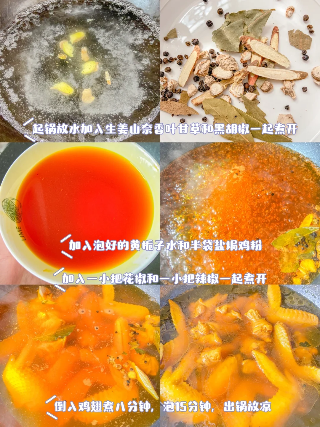 4、加入准备好的黄桅子水,和剩余的半包盐焗鸡粉,一小把辣椒,一小把花椒一起煮开