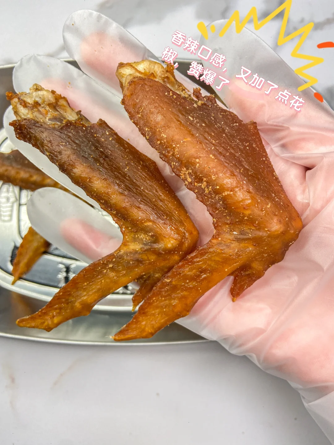 这个辣椒和花椒按照自己能接受的程度去放,烤制可晒制的时候自己也可以把控,喜欢有嚼劲的就稍微晒制久点。这个香辣鸡翅是可以放的,咱们拿个袋子或盒子放好可以慢慢吃的。