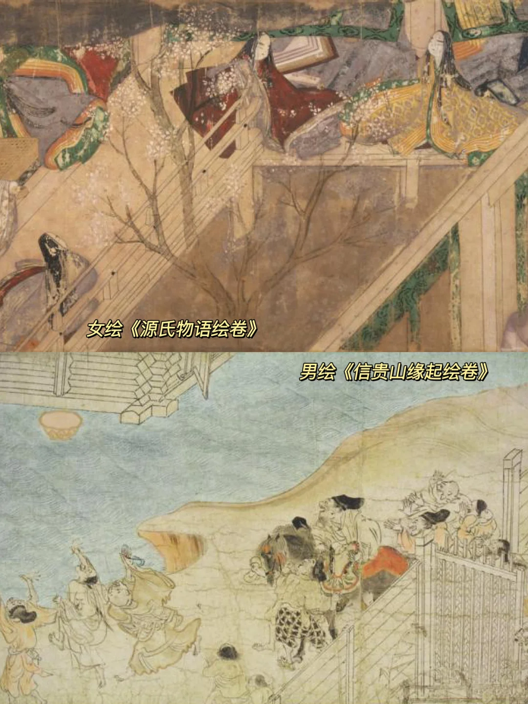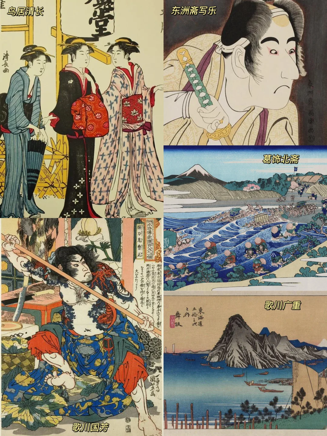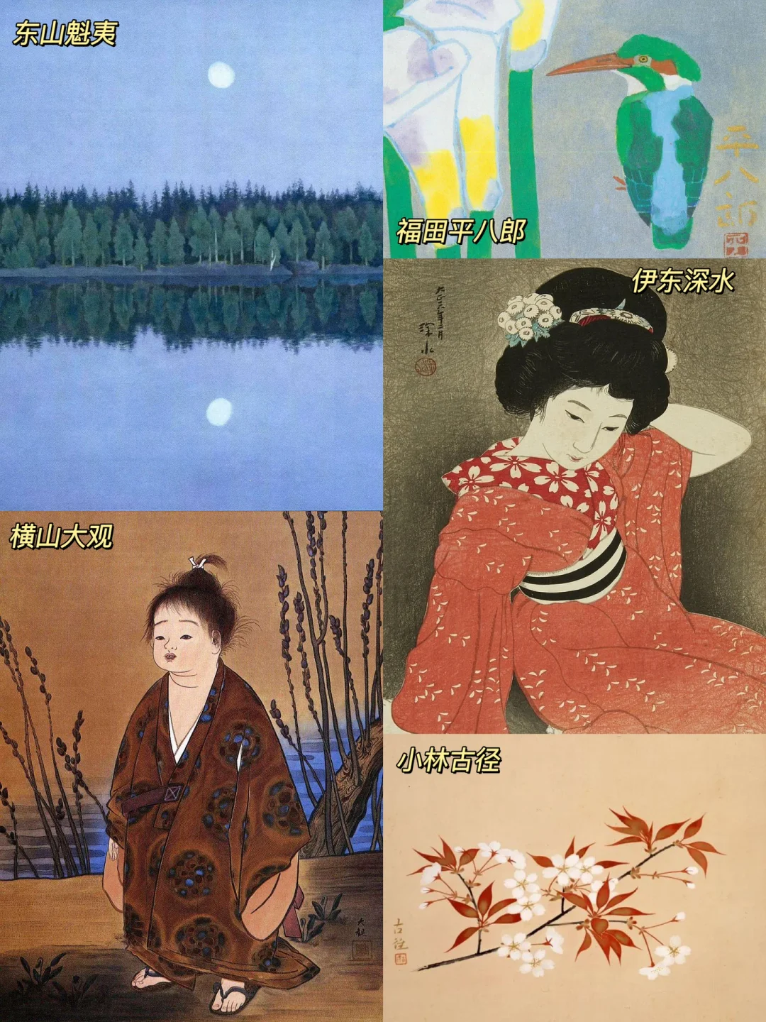 🦋从飞鸟时代到奈良时代,日本深受唐朝影响,正仓院藏品以及当时的寺庙壁画就是鲜明的例子。 🦋到了平安时代,藤原家族修建了彰显权势的凤凰堂,其中门扉上的《早春图》,虽受到青绿山水画影响,但不同于中国的江河壮阔,转而以婉转、细腻与哀物情怀,成为了本土艺术—大和绘的创作巅峰。 🦋这一时期流行的小说叫物语,物语的连环画形式叫绘卷物,分别有女绘、男绘两种类型。最知名的女绘为《源氏物语绘卷》,它采用了引目钩鼻法—由简练的线条呈现面部,人物姿态铺陈剧情—情感表达隐晦而内敛。 最精彩的男绘叫《信贵山缘起绘卷》,它借鉴了南宋绘画方法,笔触多变、线条活泼,人物表情、动作都外放且富有生趣,视觉观感非常漫画。 🦋从镰仓时期开始,中国禅宗传入日本,僧侣肖像画开始发展,兰竹、花鸟等元素被模仿,浓墨渲染、干笔点缀等技法被继承,而日式诗意,从这些融会贯通中,流露出来。 🦋室町幕府对南宋院体画极为痴迷,因此,夏圭、马远等画风备受追捧,如拙、周文、雪周一派、阿弥派皆为这一风格,其中,周文将禅宗水墨发展为“心象山水图”,而雪周将泼墨技法传承于众多弟子。 🦋安土桃山时期,武士阶级兴起了营建古堡,因为窗户小,室内需要更多照明,金箔屏障画开始流行。一直到江户时期,屏障画推动了许多画派诞生,有画风豪迈的狩野派;有水墨着色的汉画派;有四季为景的土佐派;有浪漫华丽的光琳派;还有注重写生的圆山四条派。 🦋在此期间,日本接触到了中国文人画,并以此为基础,形成了颇具本土特色的“南画”。无论是画法简略的池大雅;还是笔墨超绝的浦上玉堂;都为世人留下过精彩作品。 🦋不过以上种种的国际知名度,都比不上接下来介绍的,江户时代浮世绘。 它的题材多样,以此诞生的画家,享誉世界。比如专注美人绘的鸟居清长;耕耘役者绘的东洲斋写乐;传播风景绘的葛饰北斋、歌川广重,以及热爱武士绘的歌川国芳。 🦋明治维新过后,冈仓天心发起日本绘画改革,更多画家受到西方影响,以印象主义、写实主义、浪漫主义等画法描绘本地风土人情。 🦋20世纪,日本画坛变得更为多元,有偏重本土的小林古径;有描绘孩童烂漫的横山大观;有延续浮世绘风格的伊东深水;有采用单一颜色主题的东山魁夷;有将传统与现代结合的奥村土牛,也有受西方抽象画影响的福田平八郎等。
