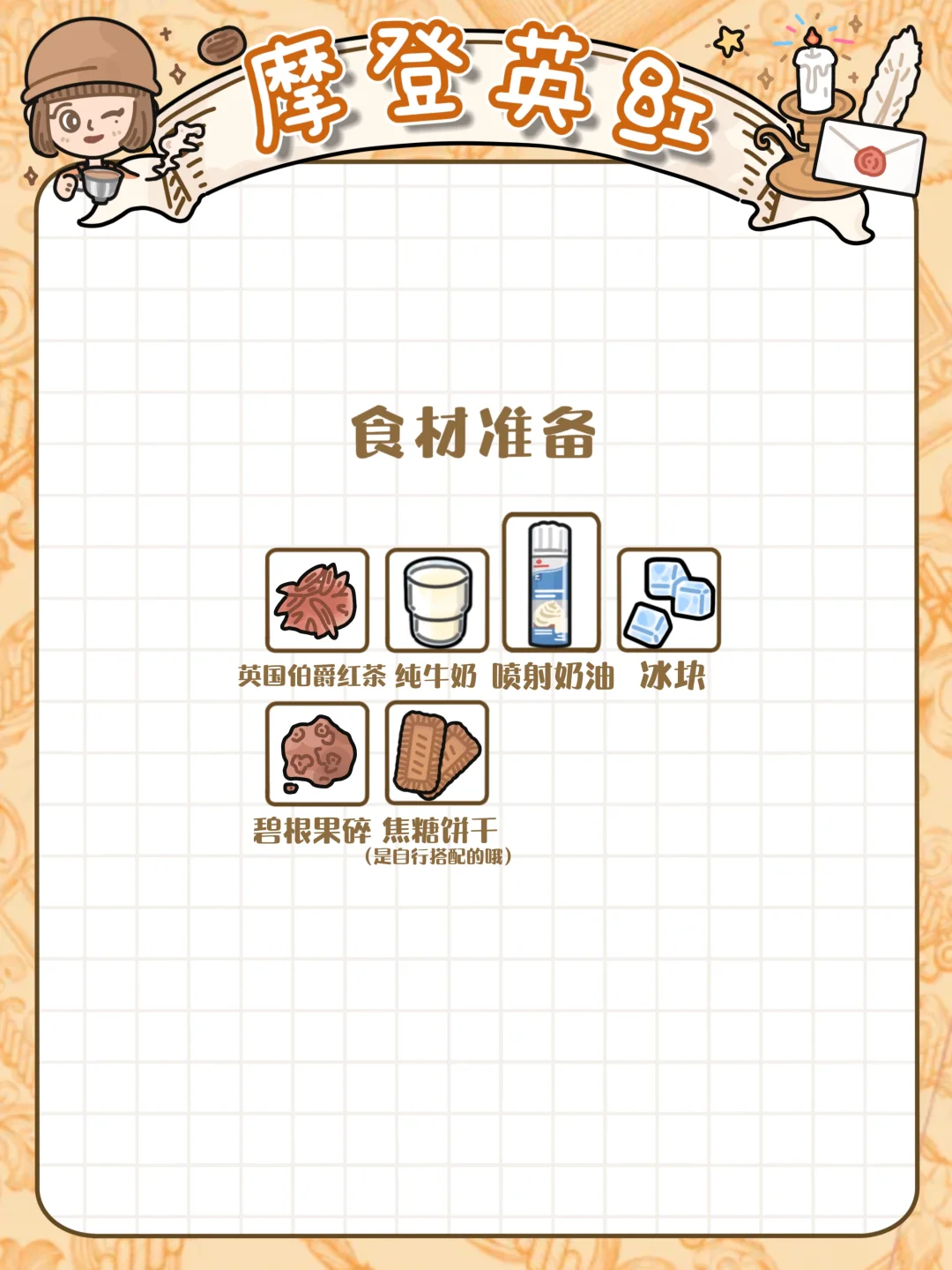英国伯爵红茶🍂|纯牛奶🥛|喷射奶油🧁|冰块🧊|碧根果碎|焦糖饼干