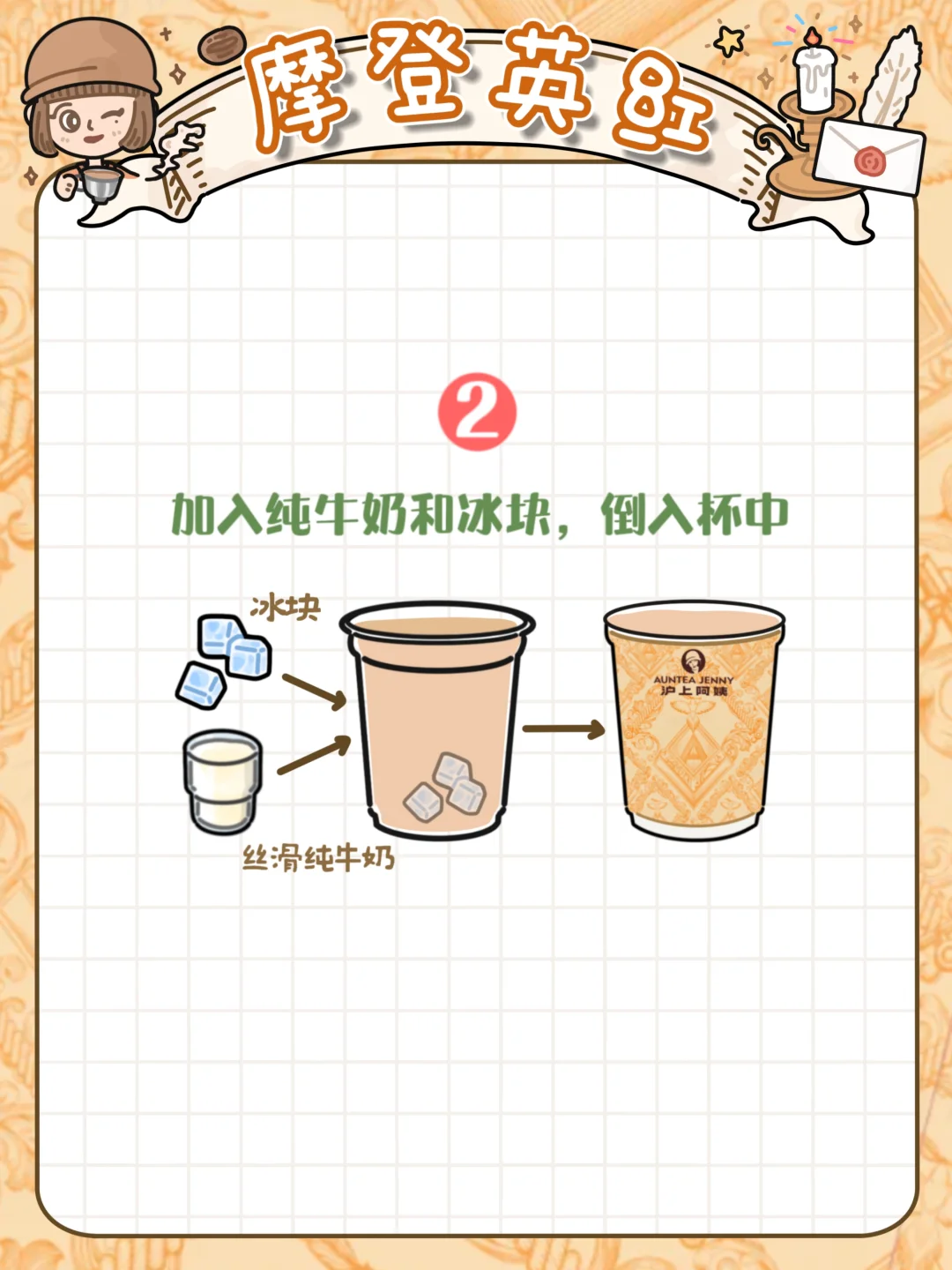 2️⃣加入丝滑纯牛奶🥛和冰块🧊,把奶茶转入杯中