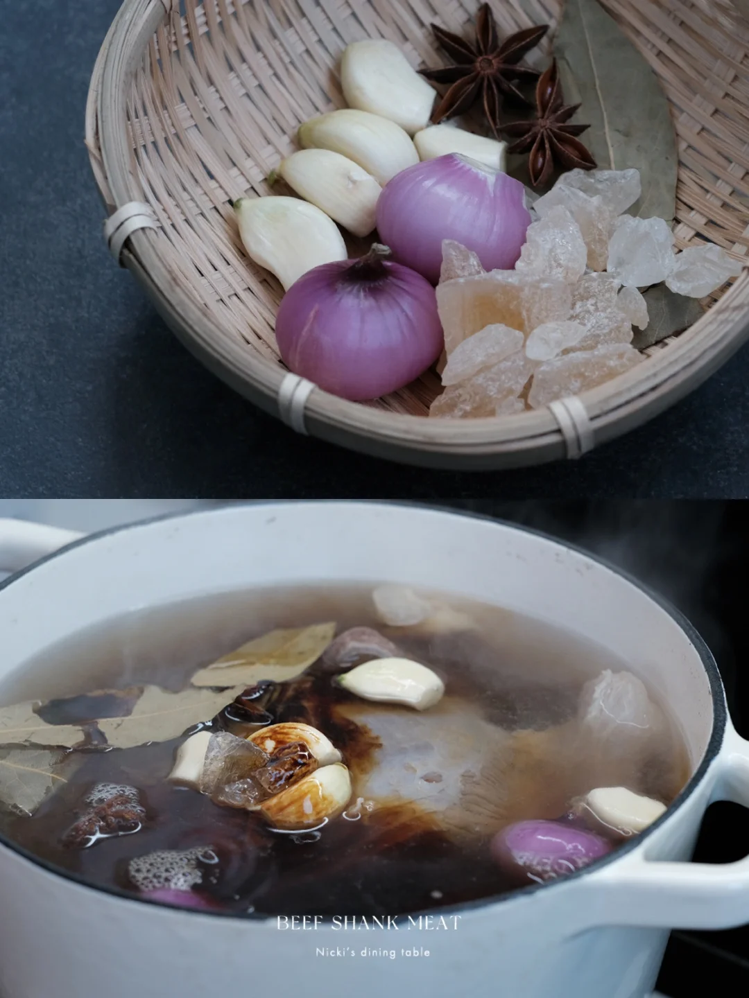 •炖锅或者铸铁锅中加入纯净水,2大勺老抽、3大勺生抽、5瓣大蒜、2个小洋葱、2个八角、3片香叶、一把冰糖、少许盐,煮开后放入牛腱子,汤汁没过牛腱子大火煮沸转小火,盖上锅盖煮1个半小时左右,期间要留意观察一下。