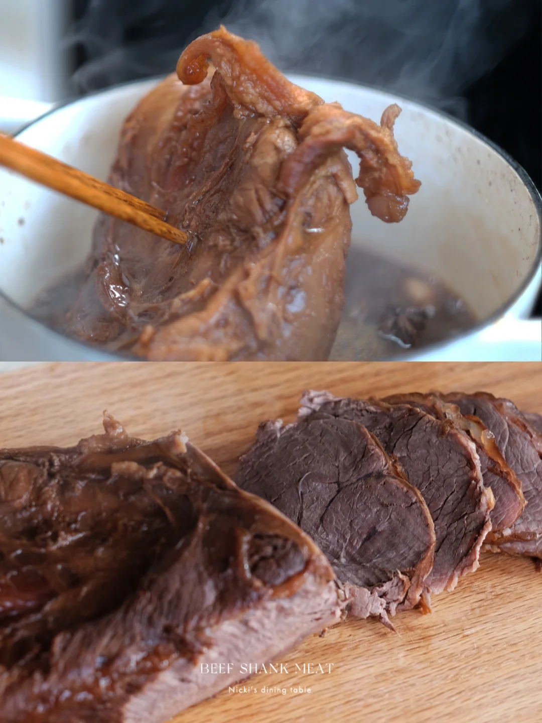 •用筷子能不费劲插入牛腱肉就可以关火了(不要煮的太嫩,稍稍有些嚼劲更好吃),盖上锅盖继续焖2-3小时左右即可切片(如果没有蘸酱的话可以焖的时间更久一些)